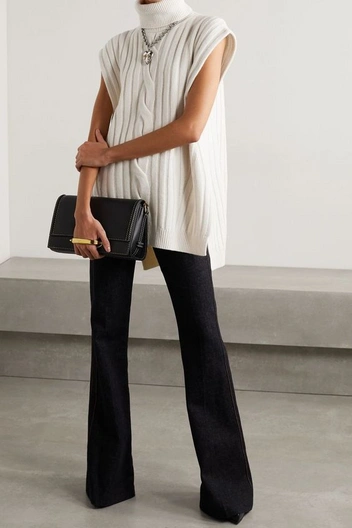 Джинсы и брюки клеш один из основных трендов на будущий длинный осенний сезон. На что стоит обратить внимание при выборе? Клеш должен быть от колена, а сами брюки достаточно длинными — пусть штанины закрывают задник обуви и полностью каблук. А их цвет будет черный или трендовый синий из необработанного денима. Вторые, особенно выигрышно будут смотреться и удлинять ноги с казаками, квадратным мысом и другой обувью на устойчивом каблуке (читайте также: Как носить брюки-клеш: примеры уличного стиля).