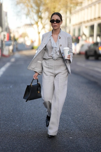 Дальше обращаем внимание на детали, которые, как всегда, меняют все. Тонкий ремень подчеркивает талию, кожаные мюли или сандалии на устойчивом каблуке вытягивают фигуру, структурированная сумка (а не тряпичный шопер) добавляет строгости. Если хочется больше подиумного стайлинга, можно поддеть под блузу тонкий трикотажный топ контрастного оттенка — вырез будет едва подсвечиваться, но образ станет визуально сложнее.