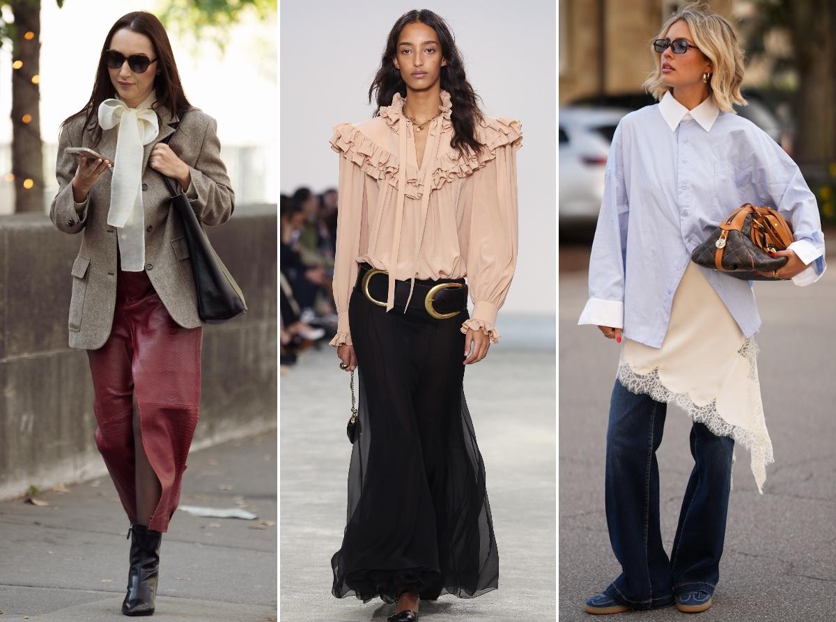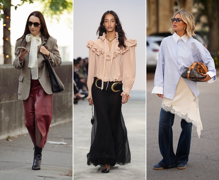 Блузы снова сделали то, что редко удается базовым вещам: из фонового слоя они превратились в главный акцент образа, вытеснив и французские водолазки, и привычные лонгсливы. В этом сезоне их особенно много — лаконичные хлопковые, полупрозрачные сатиновые, с объемным бантом, с летящими рюшами, из шелка и льна, от Saint Laurent до Chloé и Chanel, — все они подводят нас к одному и тому же вопросу: как носить их по‑новому, чтобы не скатиться в ностальгию по нулевым и ретро-косплей?