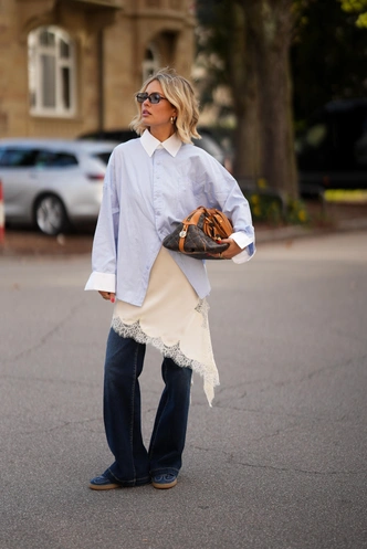 Самый простой способ носить ее модно — перестать относиться к ней как к домашней одежде. Начинаем с базы: полностью заправляем блузу в джинсы или юбку с высокой или средней посадкой, оставляя небольшой объем над поясом, рукава закатываем до середины предплечья, воротник чуть открываем — уже на этом этапе она начинает подчеркивать ваш силуэт.