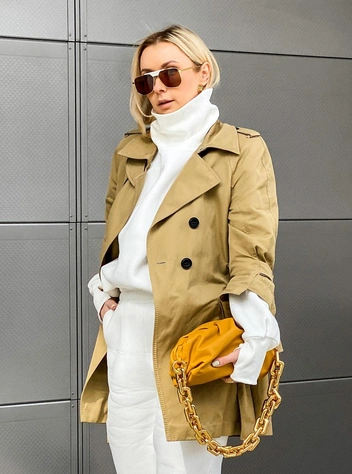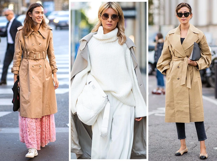 Тренч — это предмет гардероба, рассчитанный на теплую осень. Когда температура опускается, а расставаться с любимым элементом одежды не хочется, многие начинают носить его с теплым вязаным свитером, который заметно отличается по своей плотности.