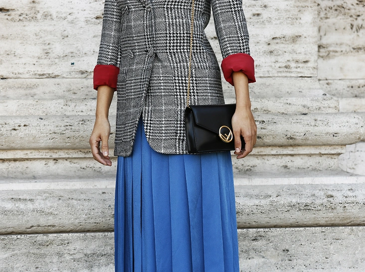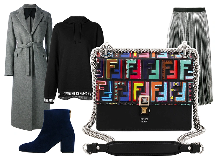 Финальный образ, который «сделает» сумка от Fendi, сложен из актуальных в этом сезоне безразмерного худи и плиссированной юбки. Дополнить его рекомендуем базовым, но утепленным пальто-халатом и ботильонами на устойчивом каблуке. Просто, но очень модно!