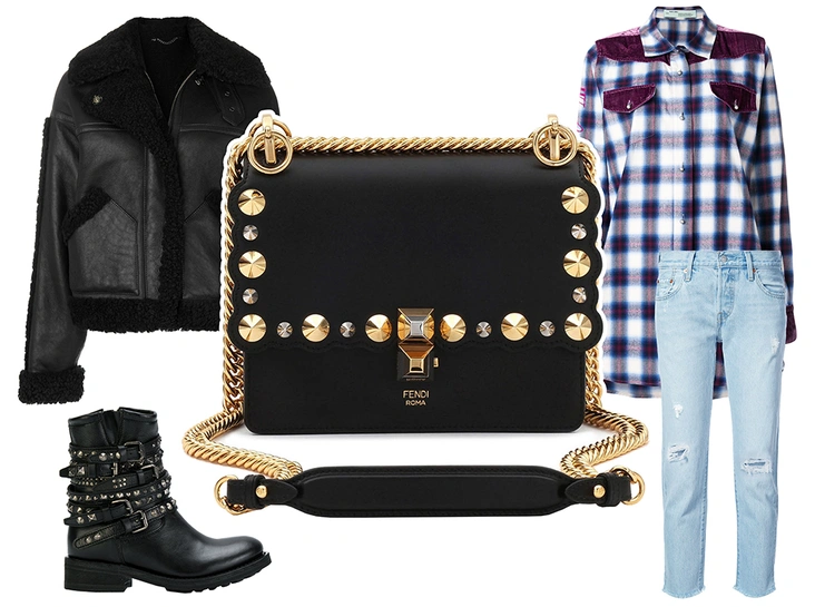 На следующий образ нас вдохновил контраст между золотистой фурнитурой сумки и ее матовой черной кожаной основой. Он идеально подходит к хрестоматийному образу в стиле гранж: фланелевая рубашка в клетку, прямые джинсы, брутальная на вид дубленка и сапоги на низком каблуке с множественными пряжками, фурнитура которых перекликается с фурнитурой сумки. Для похода на рок-концерт — лучше (и комфортнее) не придумать!