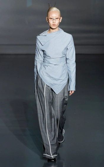 Первый яркий тренд, который был замечен на показах — это очки со спортивной эстетикой. Что их отличает? Как правило, прямоугольная форма со сглаженными углами и широкие стекла, словно одной линией закрывающие часть лица.