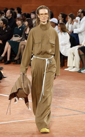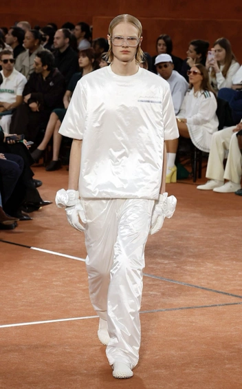 Кстати, если цветная оправа не обязательно должна быть кислотной. Например, на Lacoste показали более спокойные бежевые и белые. Обратим внимание на способ стилизации: оттенок очков совпадает с оттенком одежды, что делает образ более роскошным.