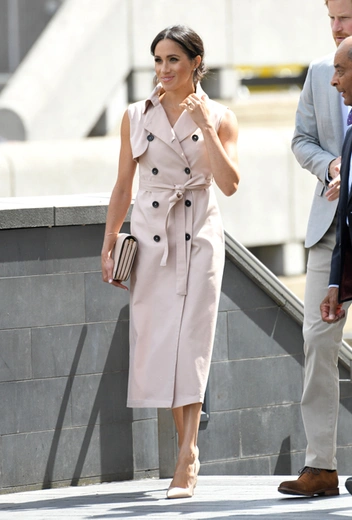 Для открытия выставки герцогиня Сассекская облачилась в розовое платье-тренч от канадского бренда House of Nonie, дополнив его лодочками от Dior, сумкой от Mulberry и украшениями от Birks. Хотя на этот раз Меган отказалась от своего любимого выреза в форме лодочки, другой ее излюбленный стилистический прием — нежный пудровый оттенок — на месте. Платье-тренч сделано по всем канонам: два ряда пуговиц, миди-длина, пояс и даже ружейный клапан — все, за исключением рукавов, как у классического тренчкота. Такое можно носить в качестве самостоятельной единицы, а можно и в качестве легкого удлиненного жакета — просто представьте, каким получится образ, если под безрукавный макинтош надеть бланковую футболку и, скажем, слегка расклешенные джинсы из темно-синего денима.