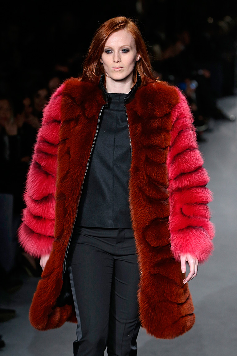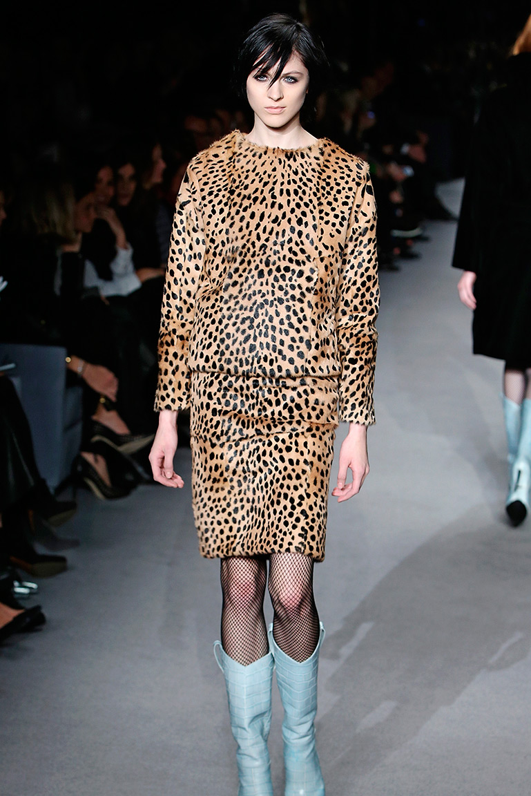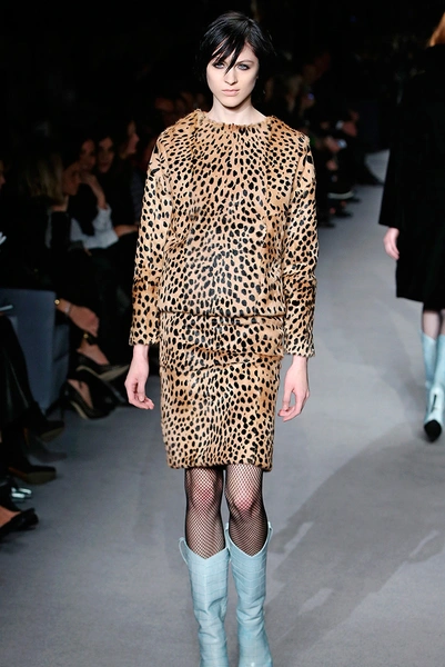 Остальная часть коллекции вдохновлена 60-ми: шубы с объемными рукавами, юбки-карандаши и узкие черные брюки. На показе дизайнер и отец Том Форд представил много вещей из кожи, в том числе красный юбочный костюм с верхней шнуровкой и сапогами в цвет. Анималистические принты тоже никуда не делись: в коллекции есть леопардовый костюм, тигровый меховой жилет и выкрашенная в малиновый цвет шуба со звериными полосками.