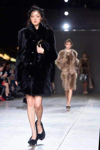 Дизайнер показал пальто в технике пэчворк и синей расцветке, а также плащи, сделанные из черной овчины.