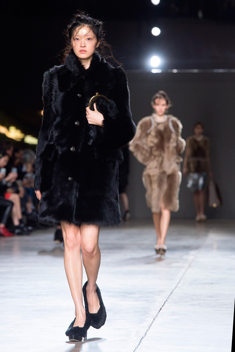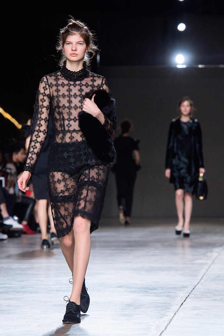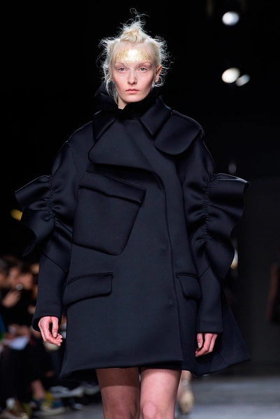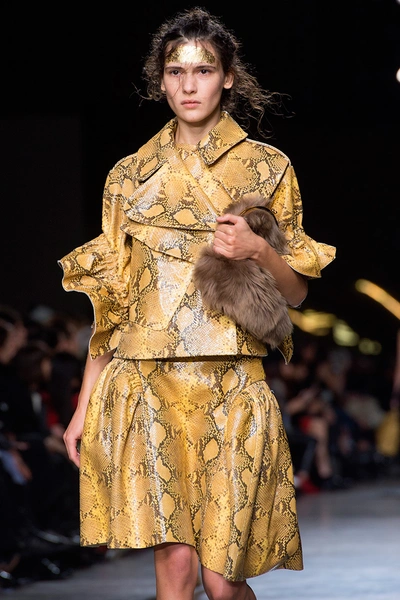 Показ Simone Rocha условно можно поделить на три части. В начале шоу модели выходили в объемной золотой одежде со множеством оборок и воланов. Для этой части дизайнер вдохновилась елизаветинским золотым веком. Особенность этих нарядов в том, что они выполнены с принтами под змеиную кожу, в некоторых возле шеи и бедер есть вышивка. Черные и темно-синие объемные пальто дизайнер украсила золотыми отворотами, придав им выразительную форму.