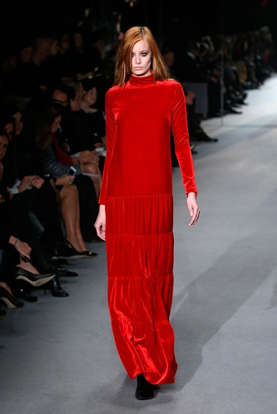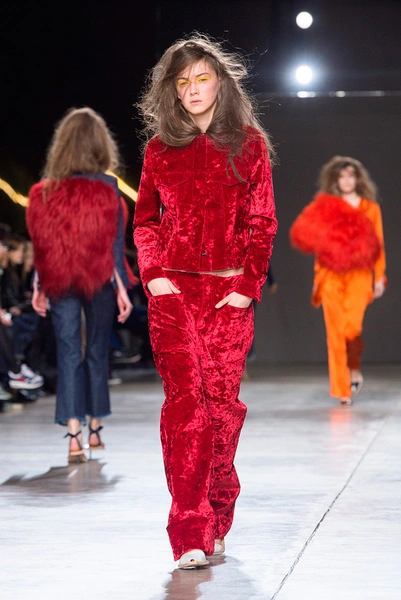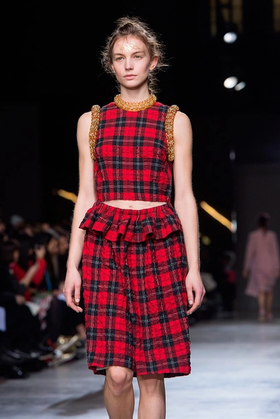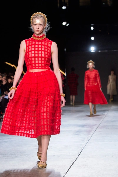 Вторая часть показа – простые кружевные платья и костюмы из бархата. Для завершения Симон Роша выбрала красный цвет – клетчатые комбинезоны и костюмы сменялись почти прозрачными платьями.