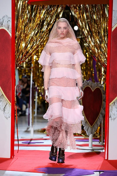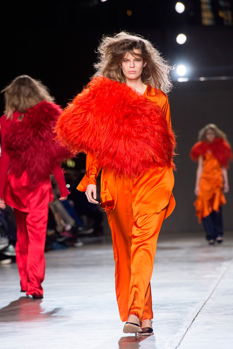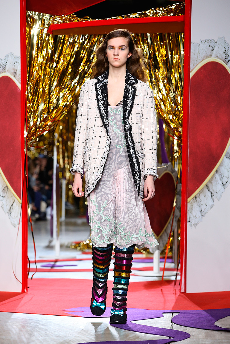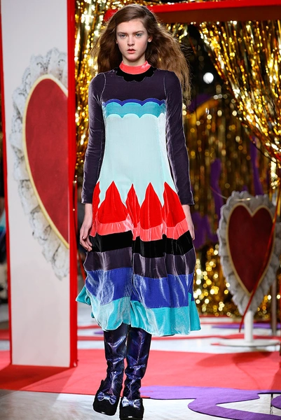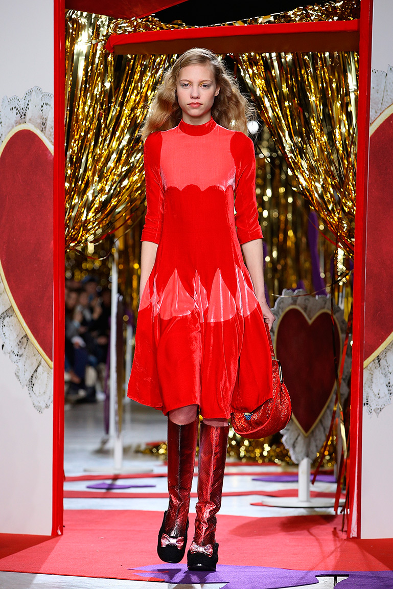 В этом сезоне дизайнеры Эдвард Мидэм и Бенджамин Кирчхофф снова вернулись к своей музе – маленькой девочке, которая нашла чердак, полный винтажной одежды. Основные цвета коллекции – красный, фиолетовый и розовый, которые отлично выделялись на фоне декорированной золотой мишурой сцены.