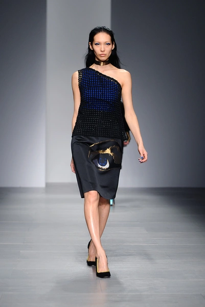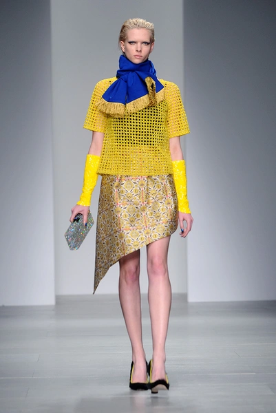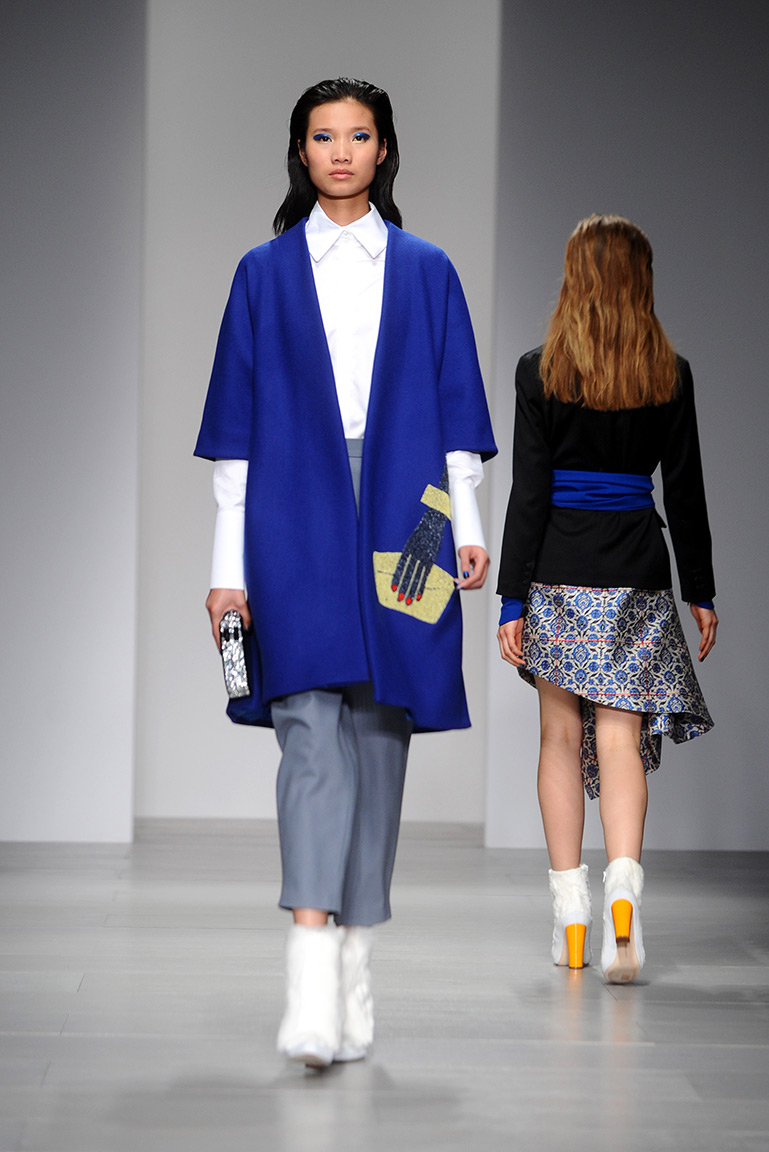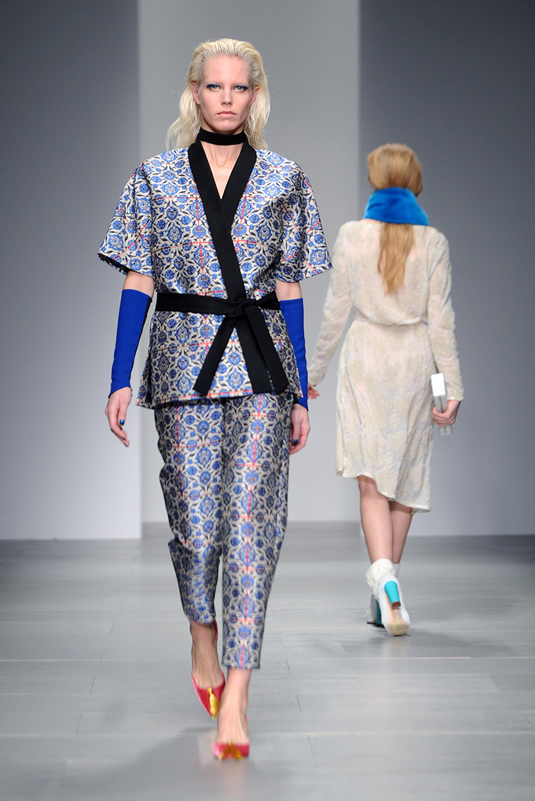 Дизайнер решил раскрасить осень яркими красками и создал коллекцию, в которой сочетаются ярко-синий, желтый и розовый цвета. Дизайнер признался, что расцветка его костюмов-кимоно и платьев с асимметричным подолом сделана на основе кафельной плитки. В качестве принтов на юбках модельер использовал изображение двух удлиненных рук, держащих сумки, а другим его вдохновением стал глаз Клеопатры, который поселился в виде принта на подолах платьев.