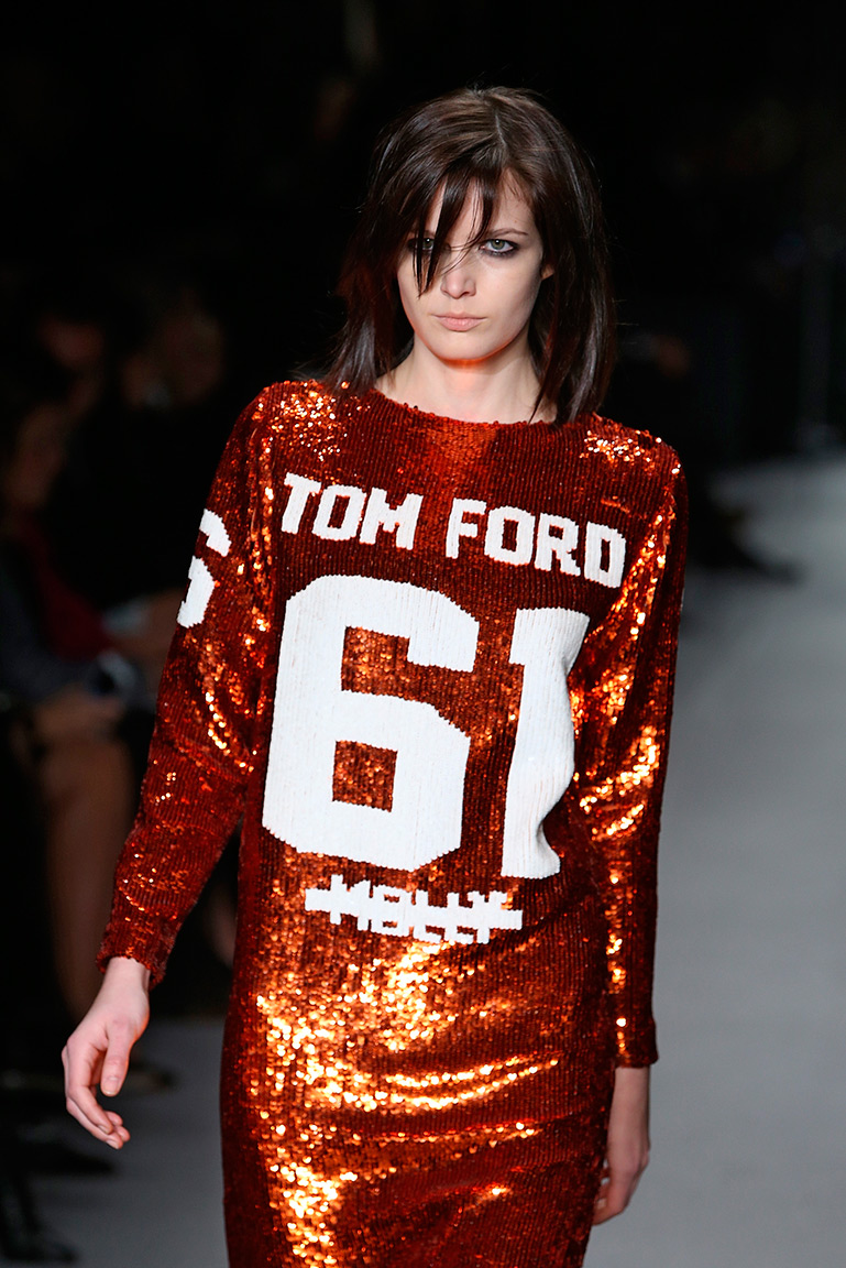 Безусловно, самой яркой частью осенней коллекции Тома Форда стали блестящие платья с пайетками, имитирующие спортивную форму. Модельер, отличающийся сексуальным дизайном и использованием леопардовых принтов, неожиданно обратился к теме спорта, как Дом Dior и Chanel на кутюрной неделе в Париже, только сделал он это в своей манере: хоть его платья и похожи на форму футболистов, модели примеряют их с высокими сапогами.