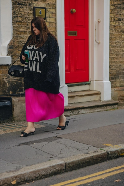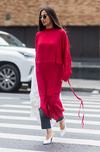Если полагаете, что трикотажное платье — это либо бесформенная вязаная масса размера oversize, либо удлиненная облегающая водолазка, которая комплиментирует разве что фигуру Беллы Хадид, расширяем ваш кругозор: сегодня можно найти самые разные фасоны — от повседневных моделей A-силуэта, до парадно-выходных макси-длины, с бархатными или кожаными вставками. Ну а к объемным платьям-джемперам всегда можно добавить широкий пояс и/или каблуки и выглядеть женственно и даже сексуально. Под вязаное платье лучше выбирать плотные матовые колготки и закрытую обувь — ботфорты, винтажные туфли, балетки. Уместен и пиджак или жилет, и кожаная куртка (стильный контраст кожи и трикотажа заслуженно любим многими дизайнерами и звездами стристайла).