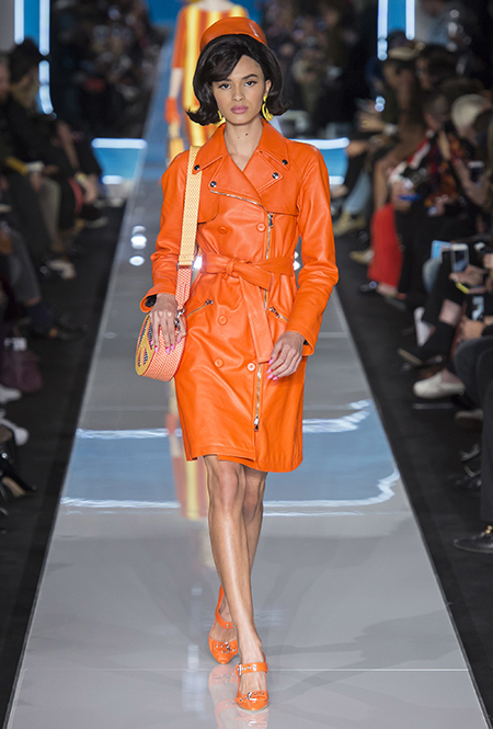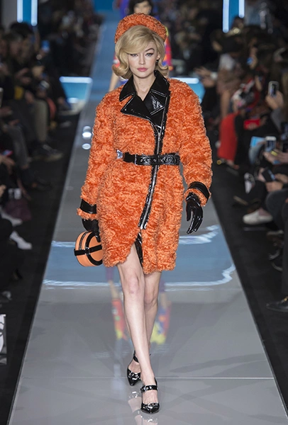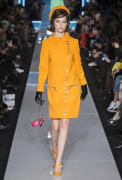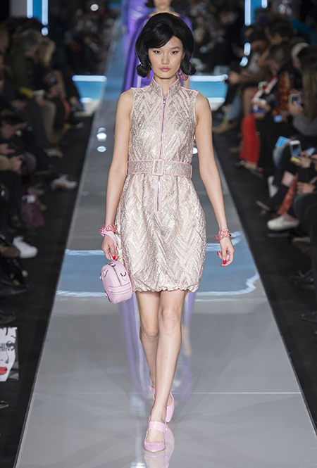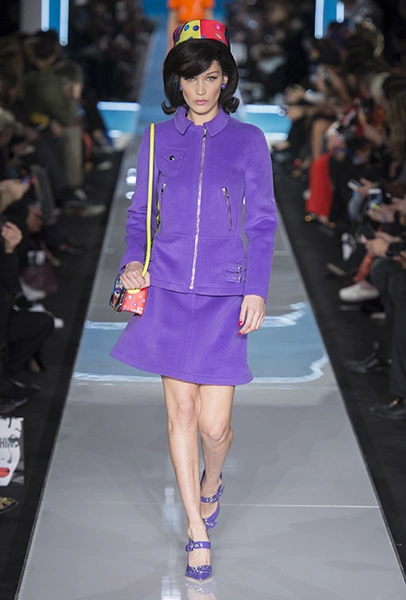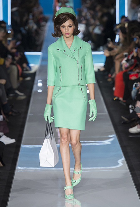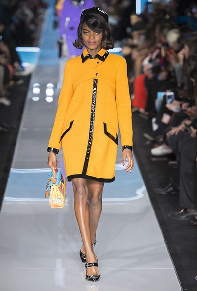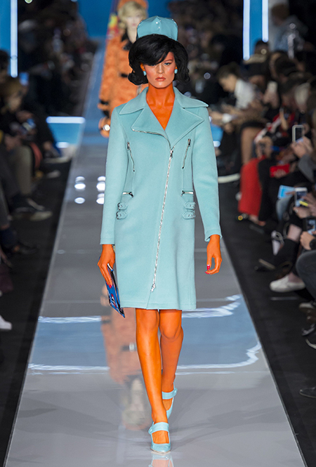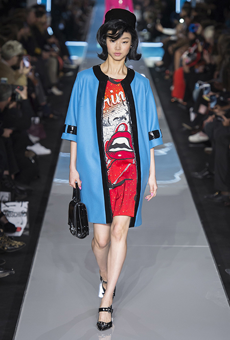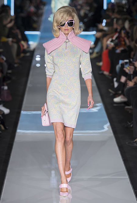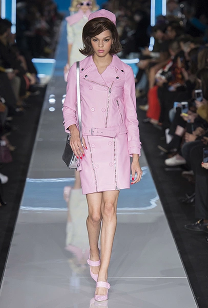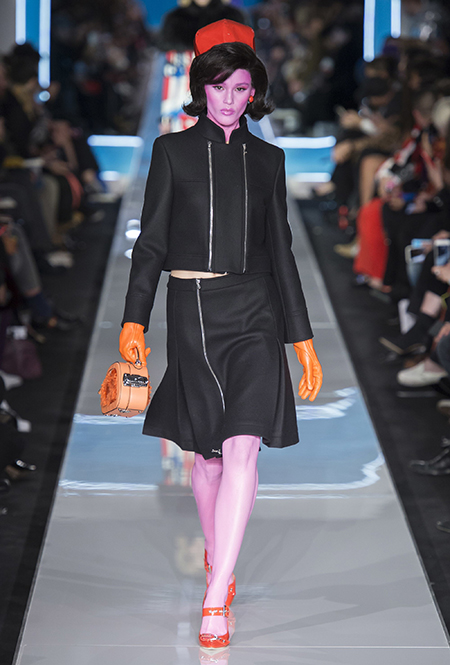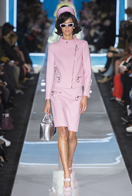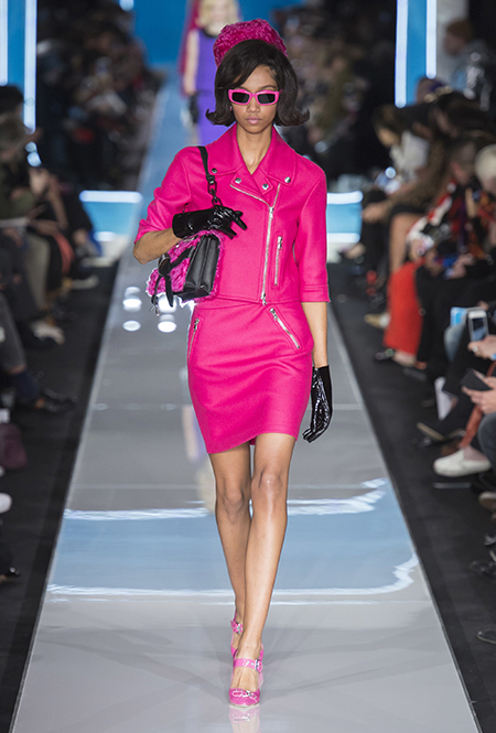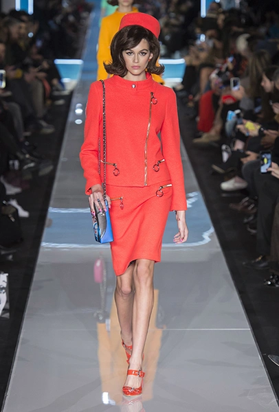 Осенне-зимнюю коллекцию Moschino Джереми Скотт посвятил любимой жене 35-го американского президента Джона Кеннеди — Жаклин. Сходство с ее стилем, получившим название «леди-лайк» и ставшим символом 60-х годов, стало очевидным с первых секунд показа, когда на подиум вышла Кайя Гербер в коралловом костюме-двойке, шляпе-таблетке и с фирменным начесом на голове, который в то время иронично прозвали «лакированным шлемом».