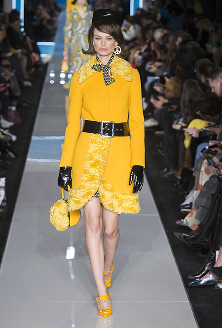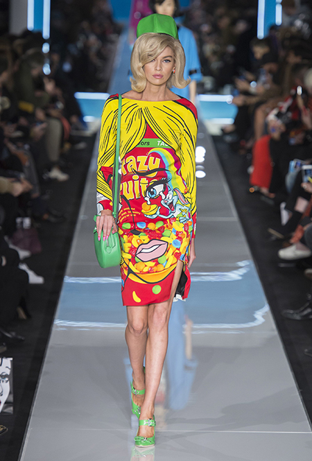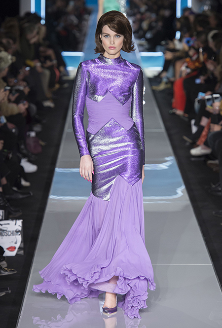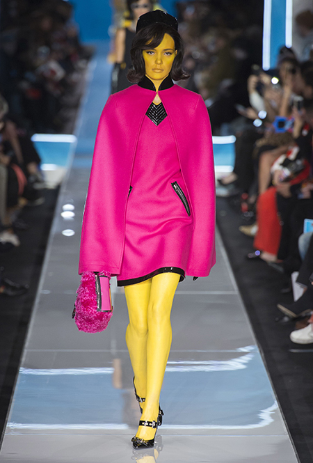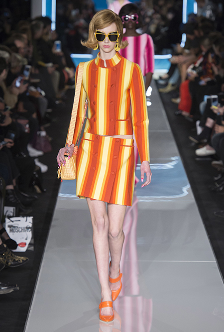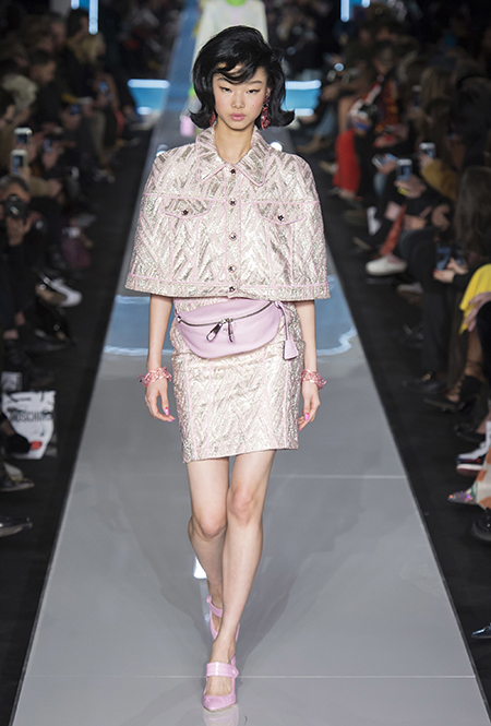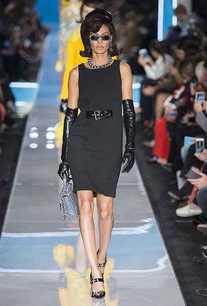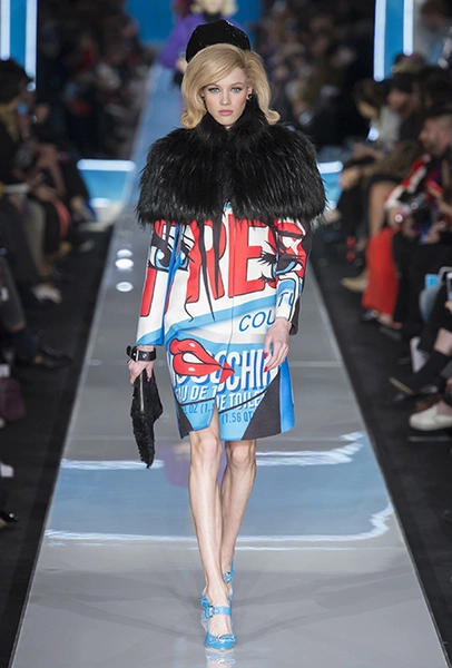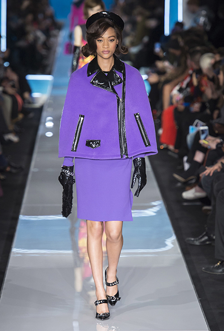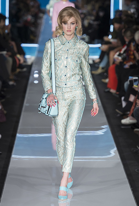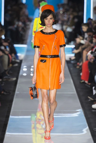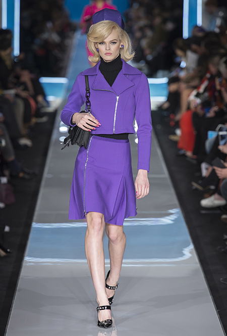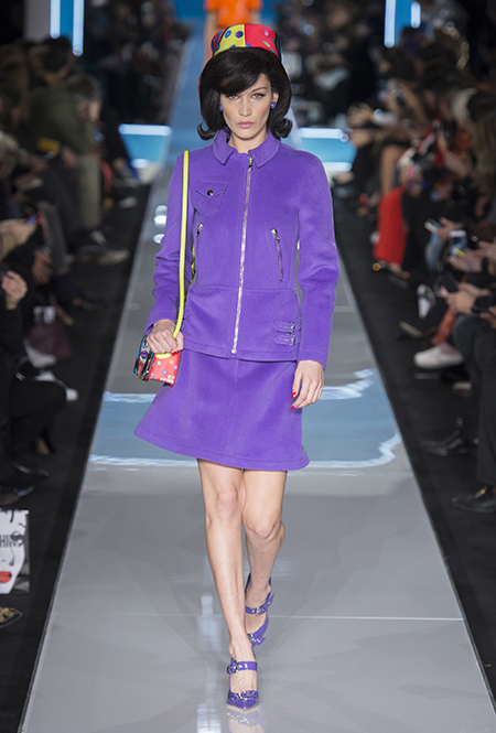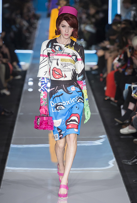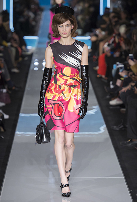 Осенне-зимнюю коллекцию Moschino Джереми Скотт посвятил любимой жене 35-го американского президента Джона Кеннеди — Жаклин. Сходство с ее стилем, получившим название «леди-лайк» и ставшим символом 60-х годов, стало очевидным с первых секунд показа, когда на подиум вышла Кайя Гербер в коралловом костюме-двойке, шляпе-таблетке и с фирменным начесом на голове, который в то время иронично прозвали «лакированным шлемом».