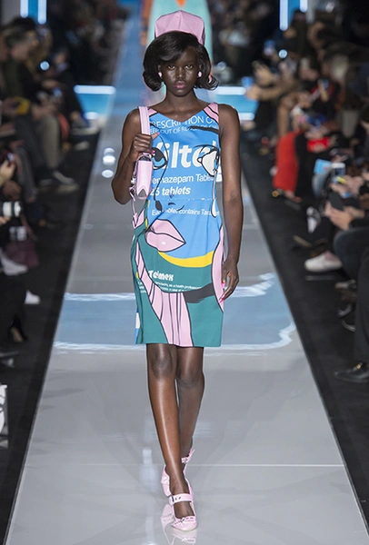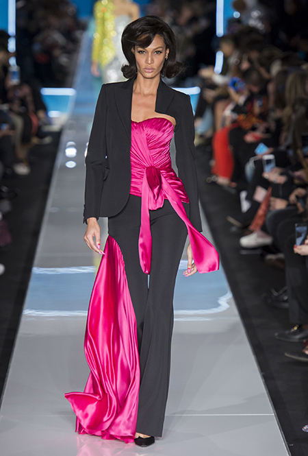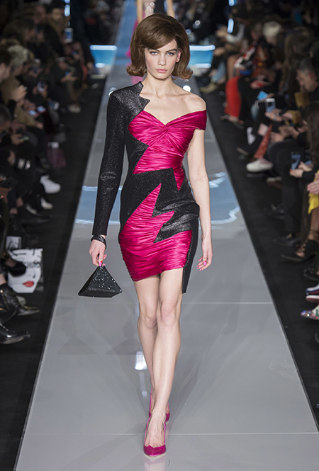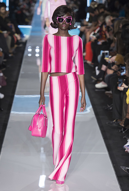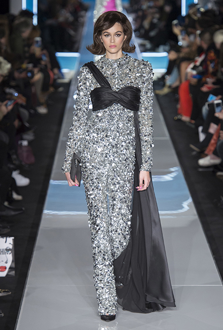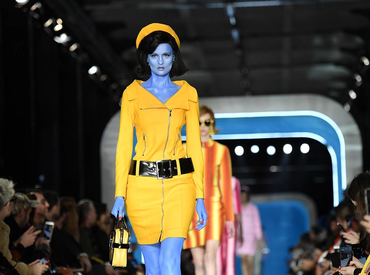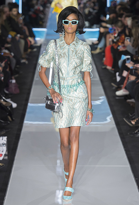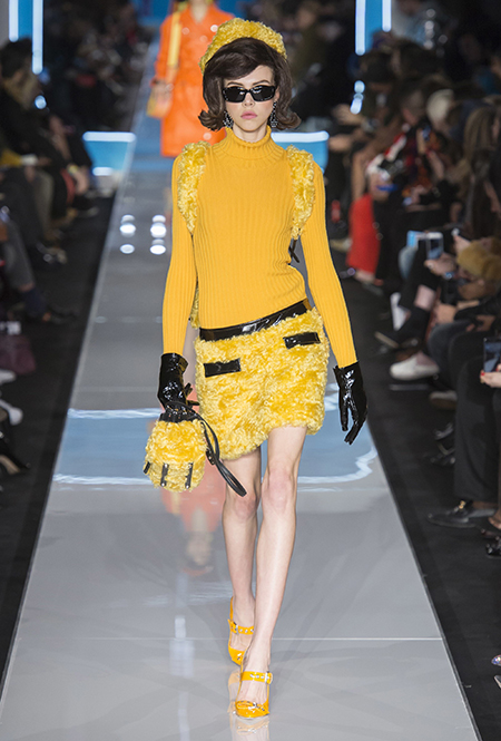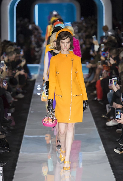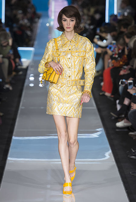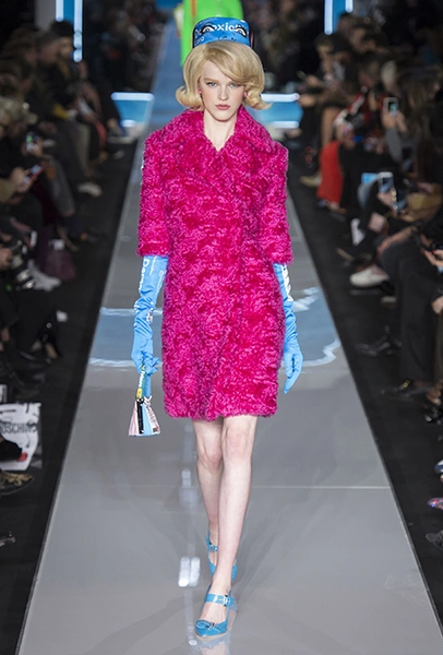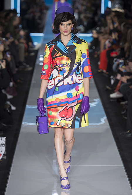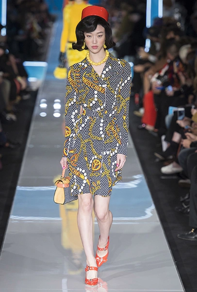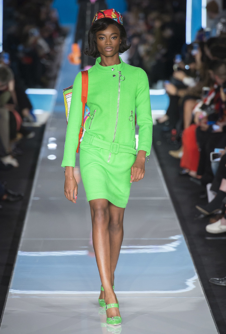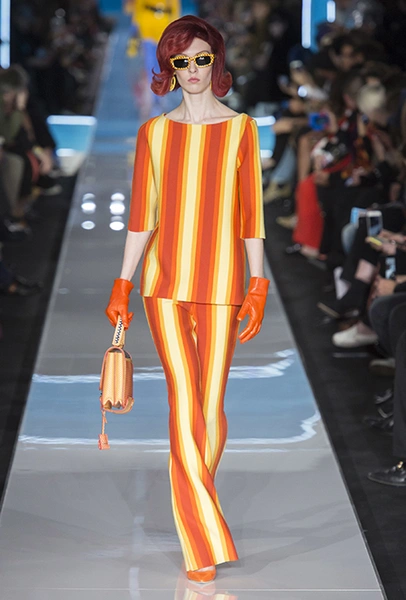 Осенне-зимнюю коллекцию Moschino Джереми Скотт посвятил любимой жене 35-го американского президента Джона Кеннеди — Жаклин. Сходство с ее стилем, получившим название «леди-лайк» и ставшим символом 60-х годов, стало очевидным с первых секунд показа, когда на подиум вышла Кайя Гербер в коралловом костюме-двойке, шляпе-таблетке и с фирменным начесом на голове, который в то время иронично прозвали «лакированным шлемом».