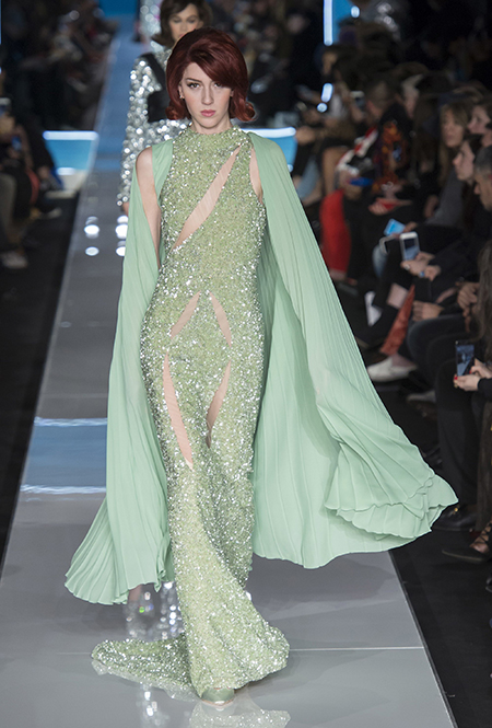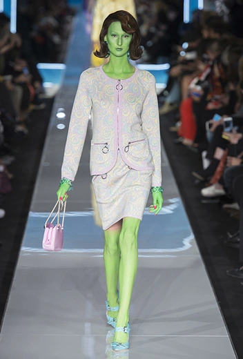 По ходу этой модной реконструкции, перебирая бесчисленное количество вариантов твидовых костюмов, труакаров и футляров знаменитой иконы стиля, Скотт обращается к инопланетной теме. На подиуме появляются модели, все так же сильно напоминающие Жаклин, кожа которых выкрашена в яркие цвета — синий (как у Кэмерона в «Аватаре»), зеленый и канареечно-желтый.