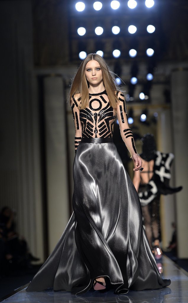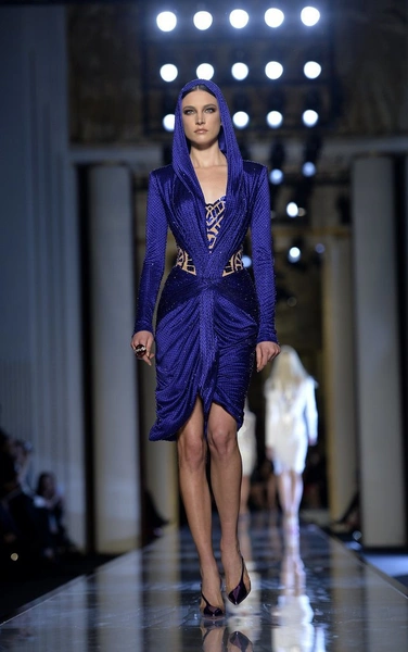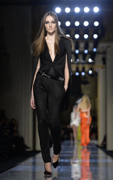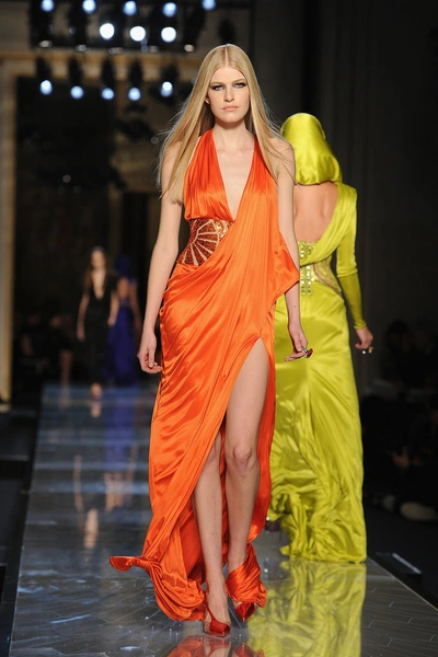 В самой коллекции преобладают типичные для Versace детали — длинные вырезы, узкие платья, мех и блеск. Но появилось и нечто новое: классические корсеты теперь телесного цвета и практически не видны из-под драпированных цветных платьев.