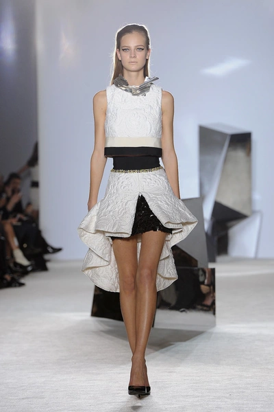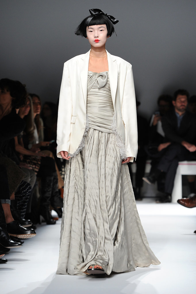 Основной акцент дизайнер сделал на бедрах, оборачивая их в шелк контрастных цветов. При этом в коллекции он использовал свой фирменный прием: перед платья значительно короче низа.