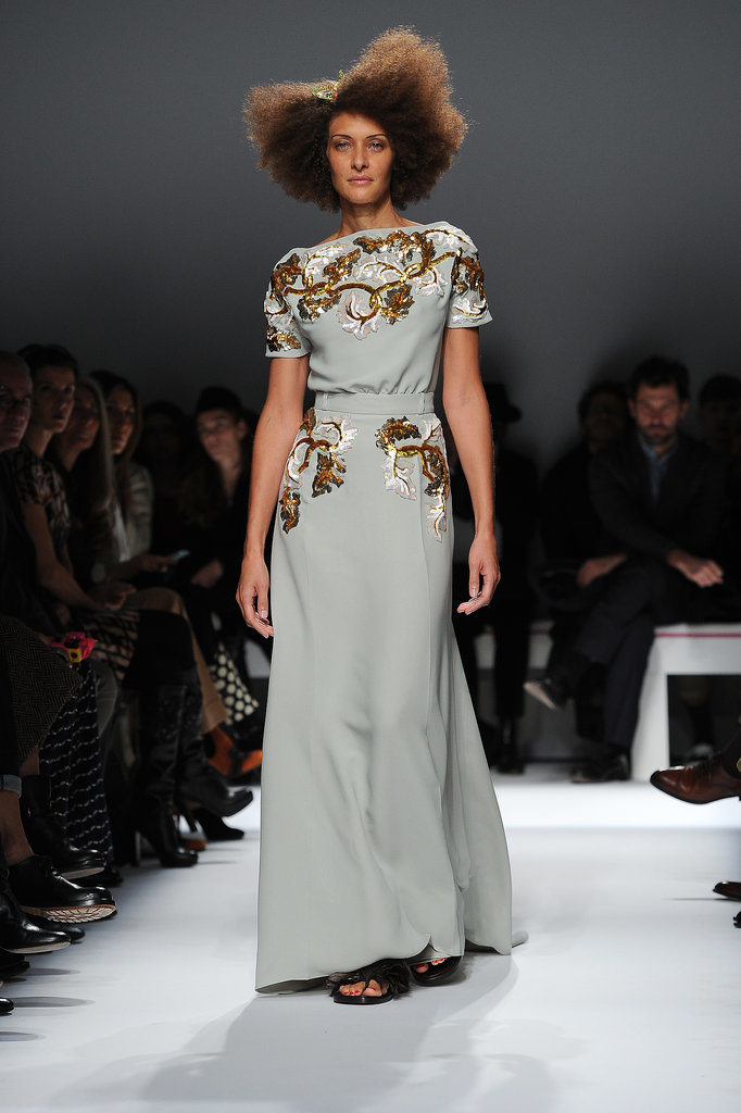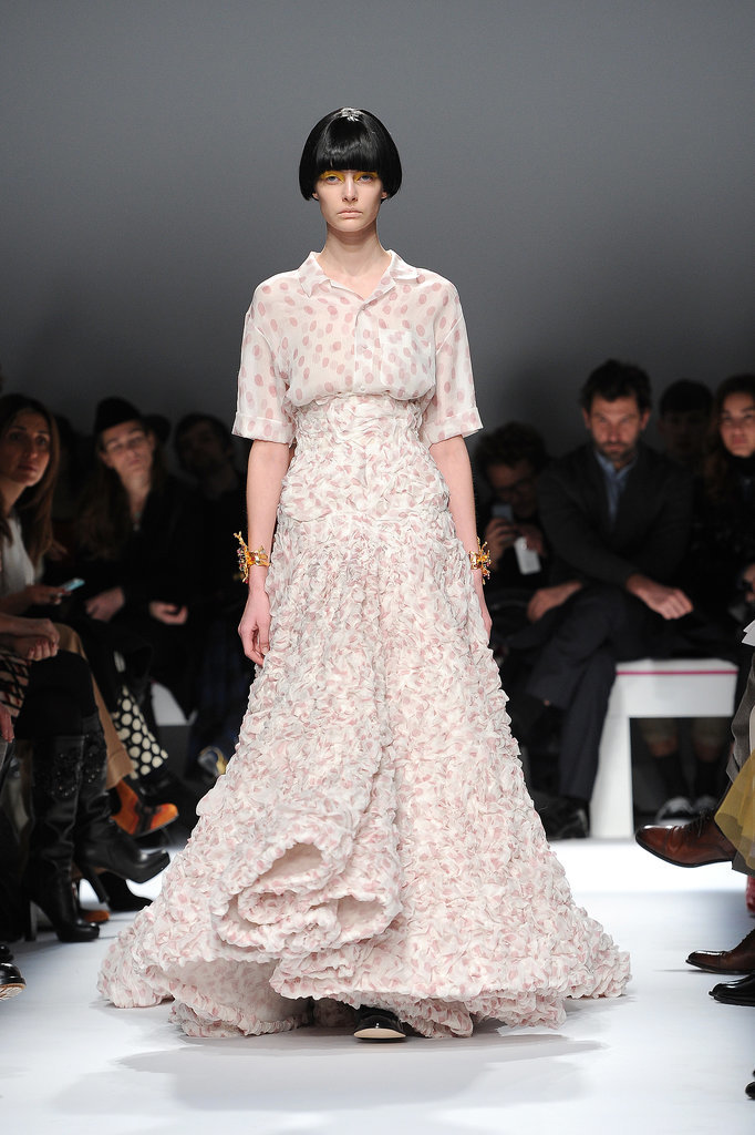 Материалы для коллекции, как и сорок лет назад, создавались с особой тщательностью: горошек на нарядах нарисован вручную, а вышивка неясных бледно-зеленых листьев на пальто заняла около двухсот часов работы.