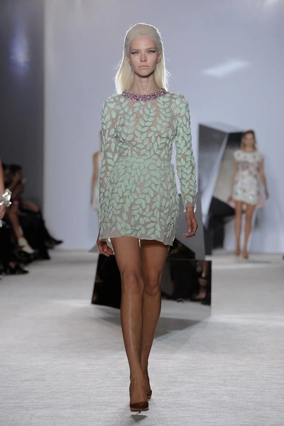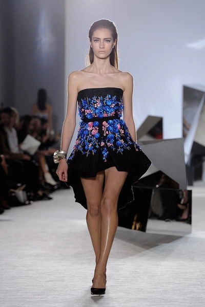 В основе коллекции - цветочные мотивы, но платья выглядят более дерзко, чем прошлой весной: они короткие, с геометрическими вышивками из камней и в неоновых оттенках.