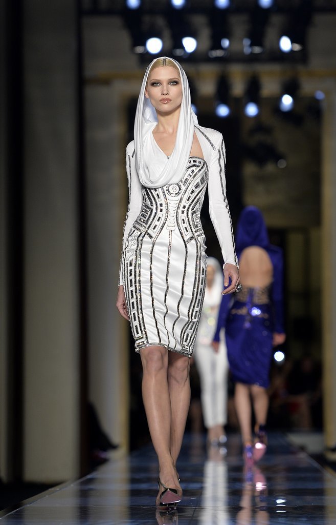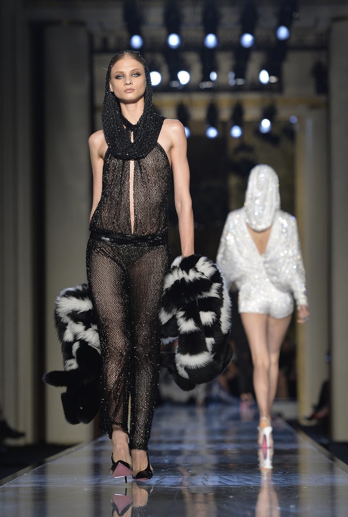 Традиционные облегающие платья в этом году дополнены капюшоном «худи» и частично состоят из прозрачного тюля, геометрично расшитого кристаллами.