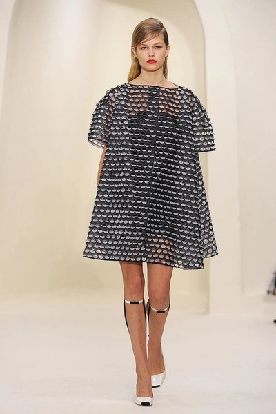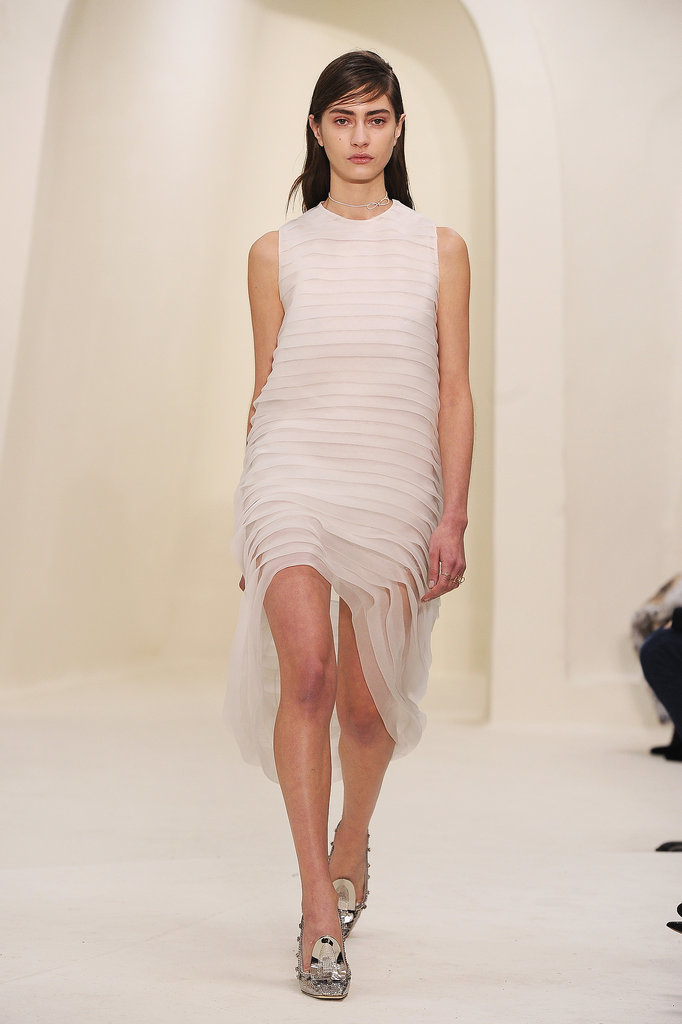 Раф Симонс (Raf Simons) сделал ставку на прозрачность и легкость: ткани в его нарядах либо полностью перфорированны, либо просто прозрачны. "Отверстия" на платьях и юбках самых разных размеров и форм - иногда по текстуре напоминают пену, а порой и русалочью чешую.