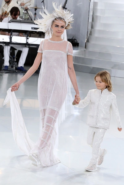 Показ завершила Кара Делевинь (Cara Delevigne) в свадебном платье и с венком из волос на голове. За руку она ведет 5-летнего крестника Карла Лагерфельда.