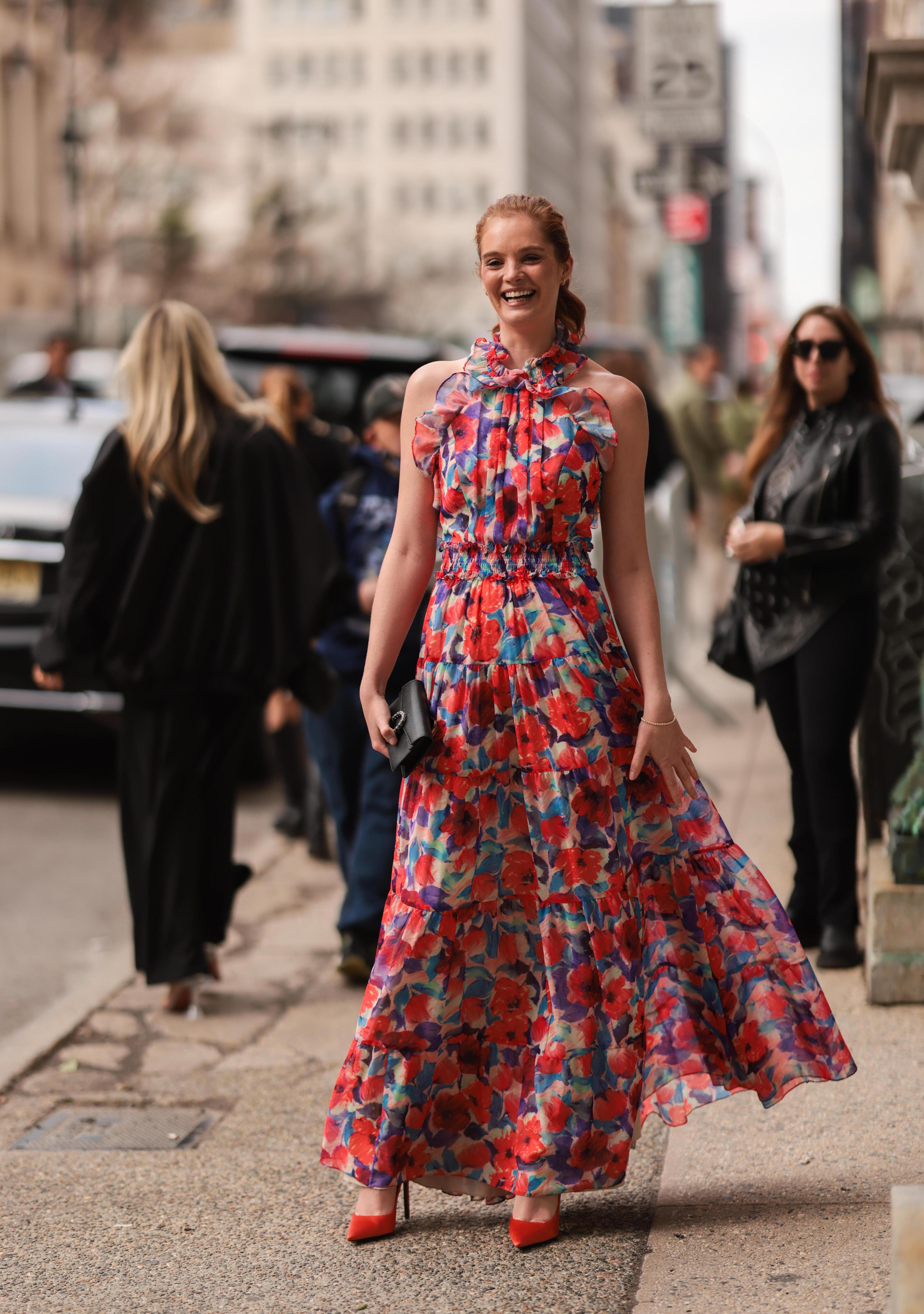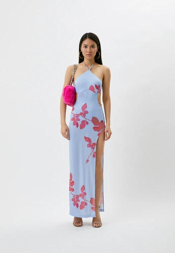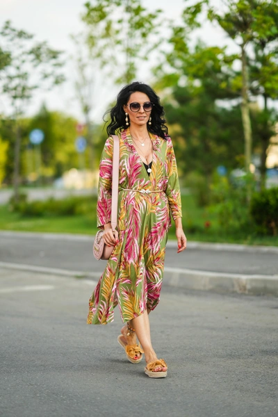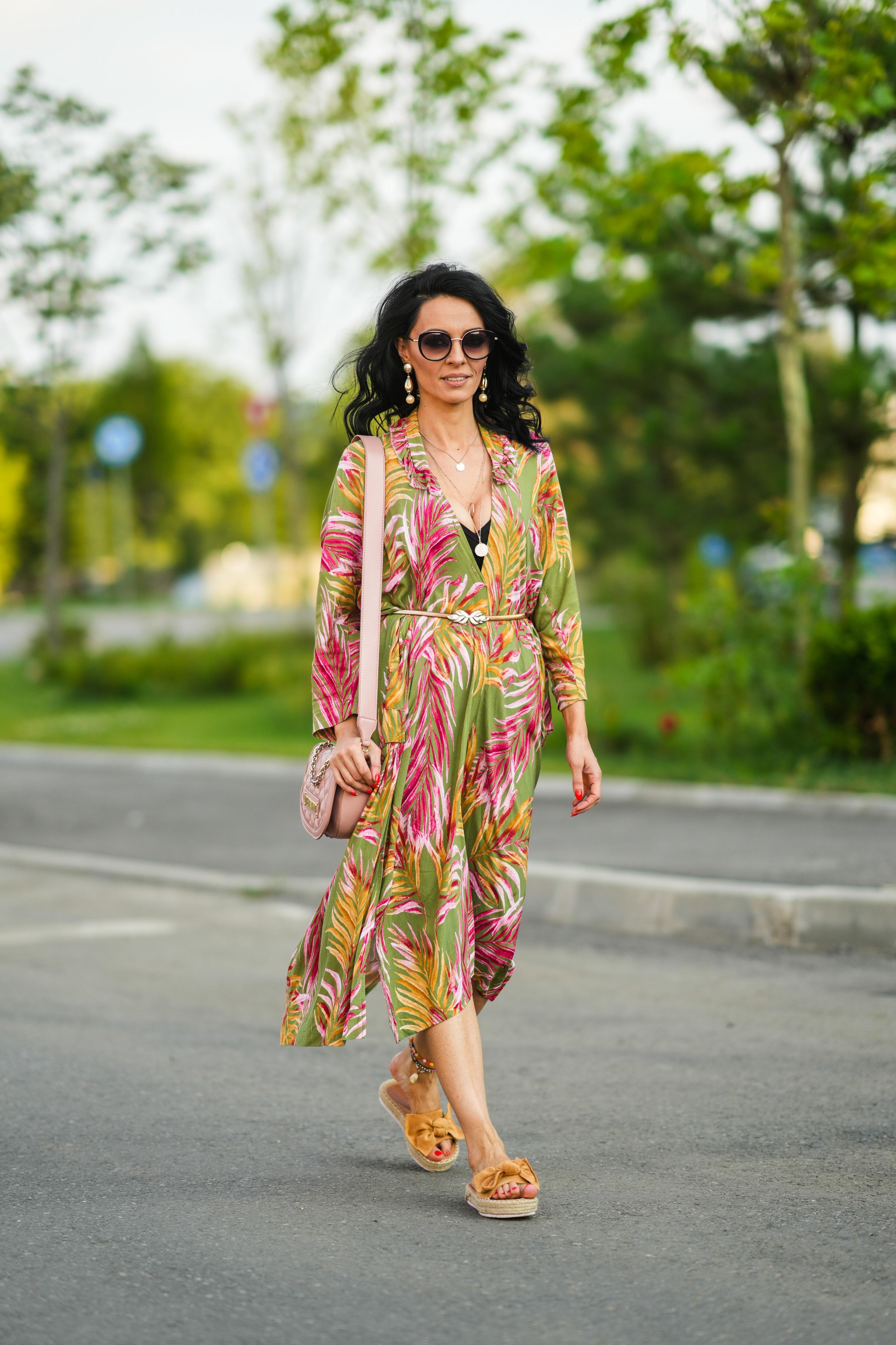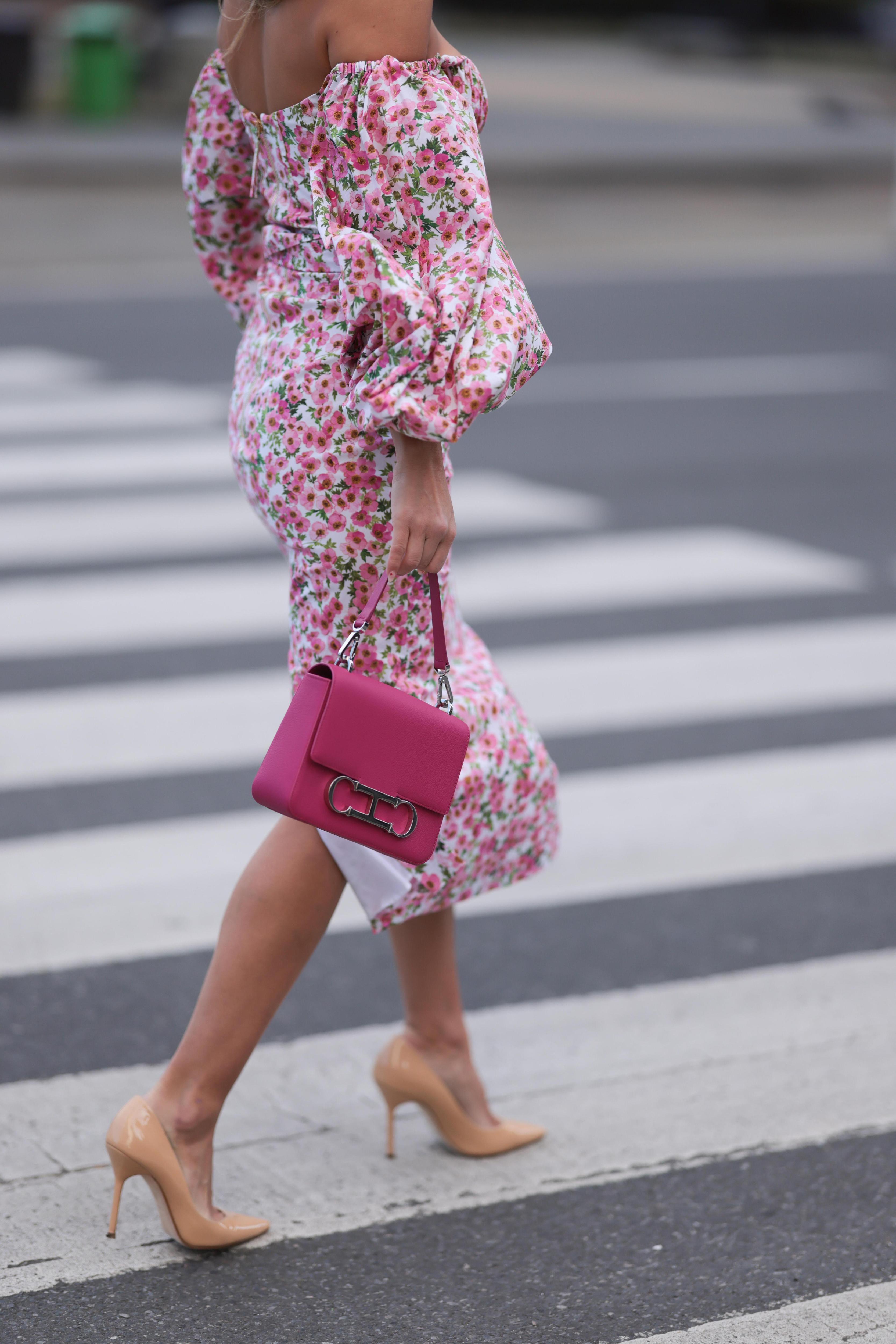 Как его носить летом? Подберите к платью босоножки под основной тон наряда или примерьте акцентную обувь, которая будет перекликаться с оттенками цветков, например, синюю, ярко-розовую или красную. Такой же может быть и сумка: небольшой аксессуар из кожи или бусин в необычной форме или с необычной деталью.