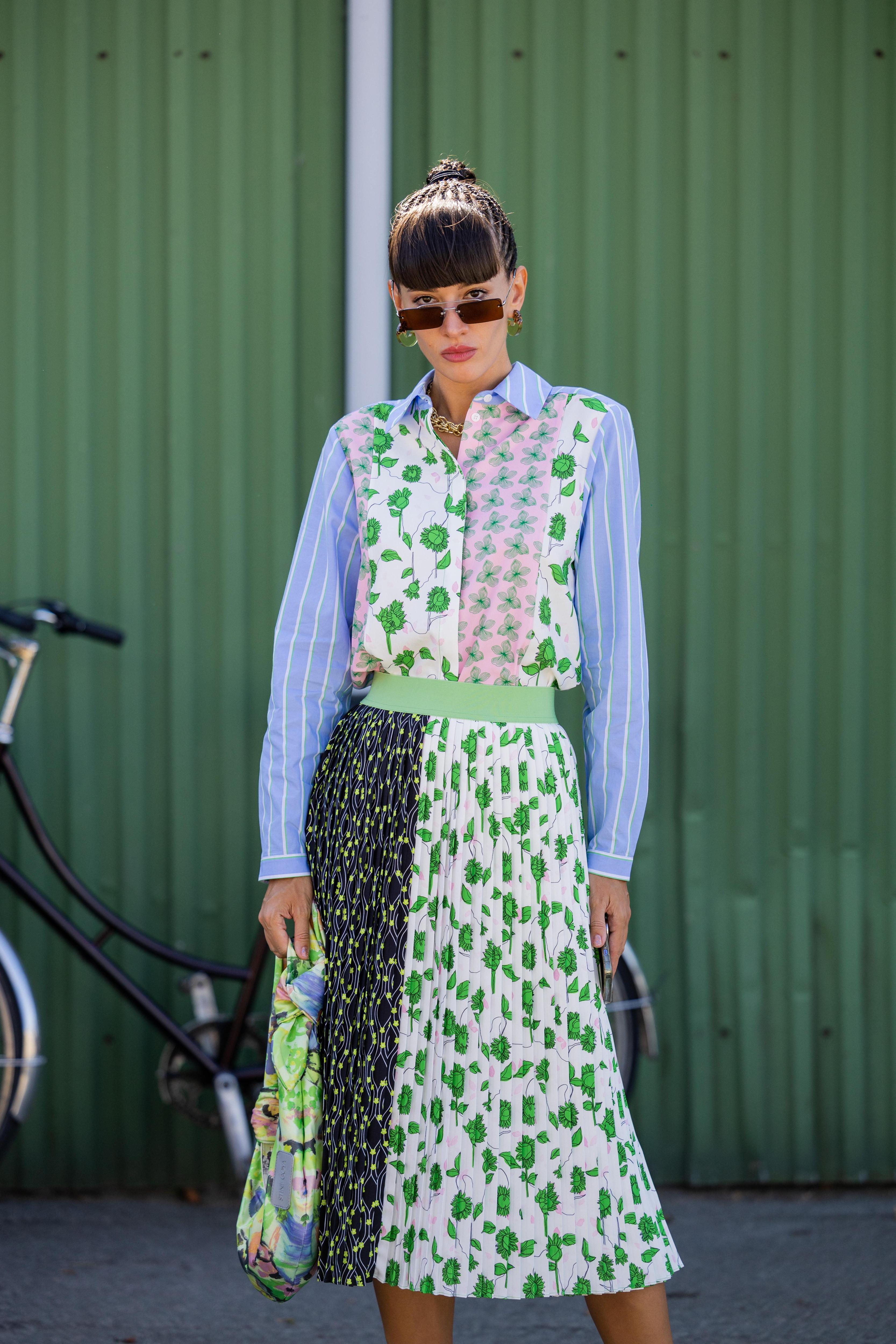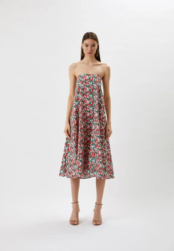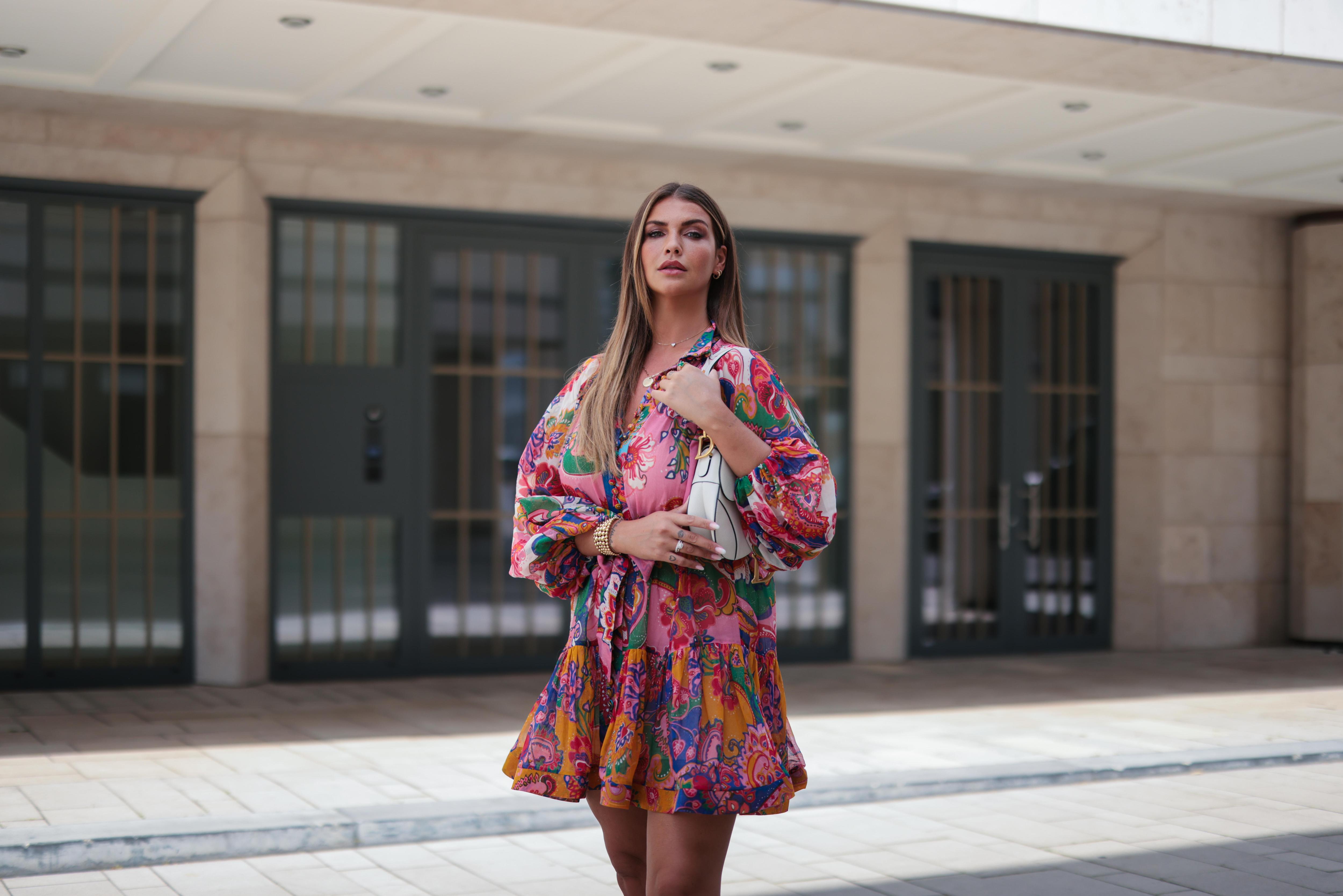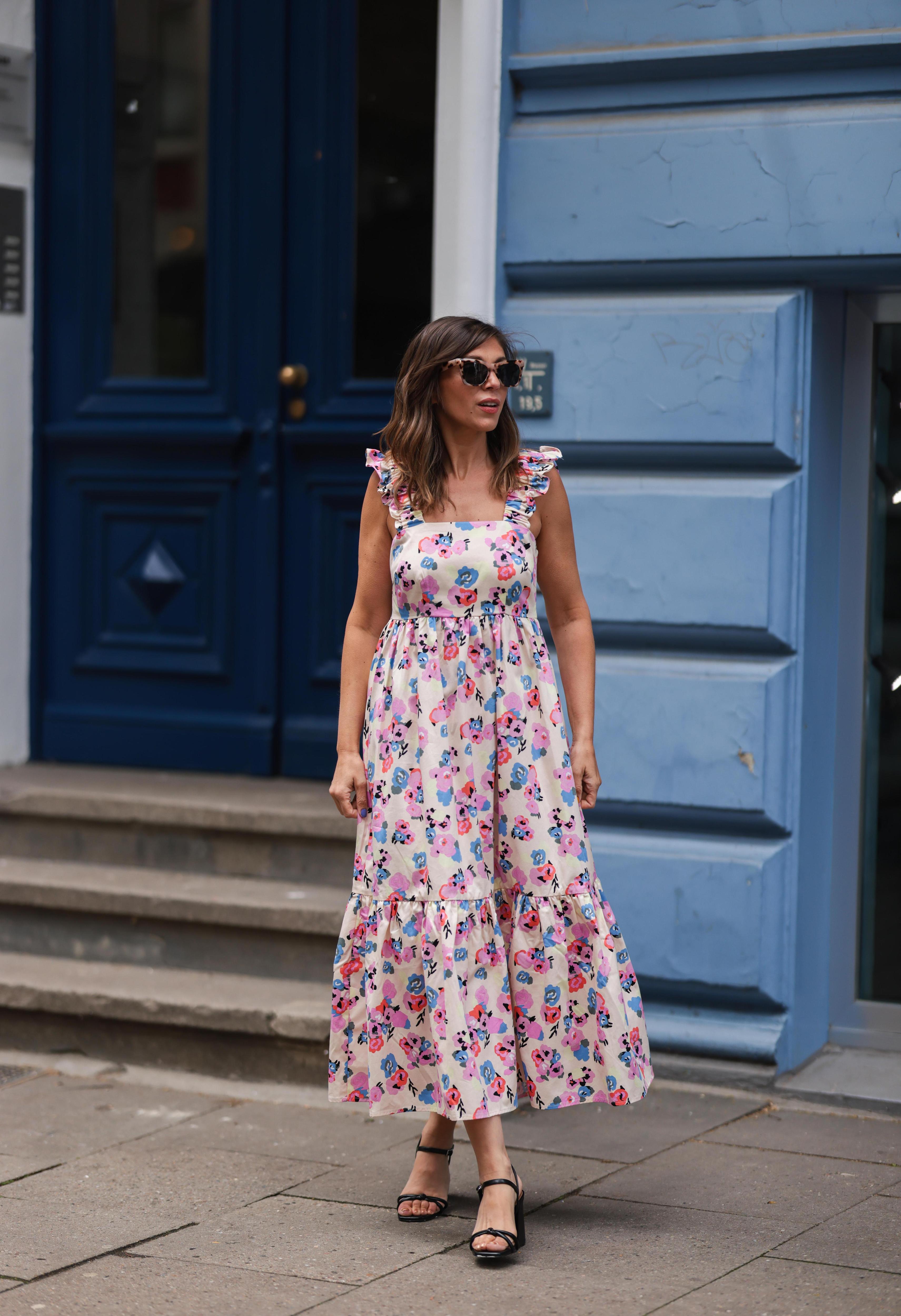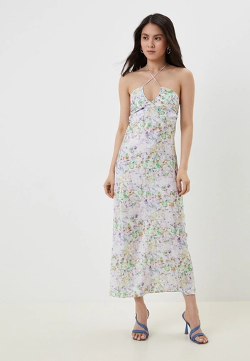 Как его носить летом? Подберите к платью босоножки под основной тон наряда или примерьте акцентную обувь, которая будет перекликаться с оттенками цветков, например, синюю, ярко-розовую или красную. Такой же может быть и сумка: небольшой аксессуар из кожи или бусин в необычной форме или с необычной деталью.