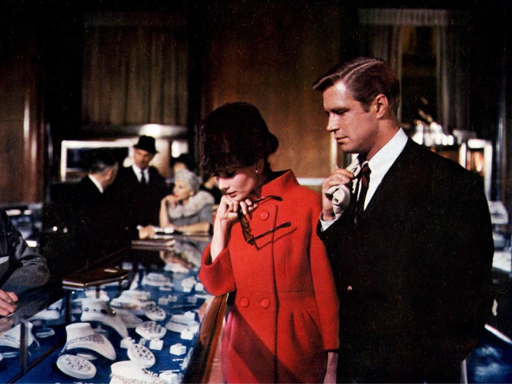 Личный стиль Одри Хепберн строился не только на элегантных силуэтах, но и на акцентных, порой контрастных деталях. Так и в этом образе, в компаньоны к элегантному приталенному пальто актриса добавляет объемную меховую шапку с черно-белыми горизонтальными полосами и белые перчатки. Кстати, к образу своей героини из фильма «Шарада» Одри также добавила удлиненные белые кожаные перчатки, сделав лук ярким и запоминающимся.