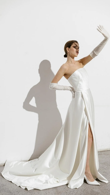 Многие девушки мечтают о белоснежном платье с длинным шлейфом, который будет сопровождать вас во время свадебной церемонии. Дизайнеры видят его по-разному: это могут быть элегантное платье А-силуэта с сексуальным разрезом сбоку или же трапециевидная модель мини в духе семидесятых с кейпом, плавно переходящим в шлейф. Подбирайте к свадебному образу остроносые лодочки или туфли с открытой пяткой и дополняйте его лаконичными украшениями.