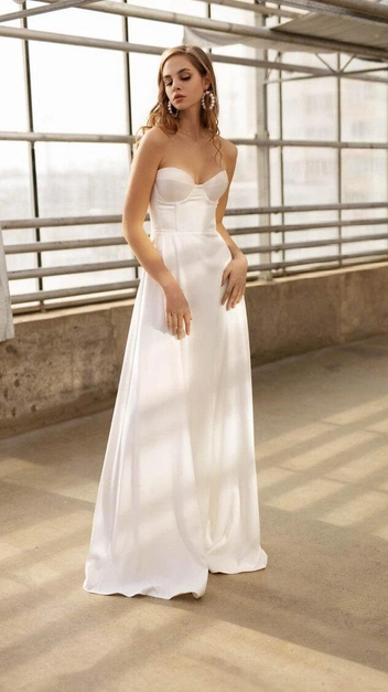 Мода на винтаж пробралась и в свадебные коллекции, поэтому мы, вдохновляясь церемониальными платьями Кристи Тарлингтон и Жизель Бюндхен, засматриваемся на модели-бюстье, что повторяют форму лифа и подчеркивают грудь. Они напоминают нам девяностые вместе с их стилем, непринужденностью и нежностью. Выберите то платье, что вам ближе: лаконичный силуэт с корсетом или дерзкое мини без бретелей.