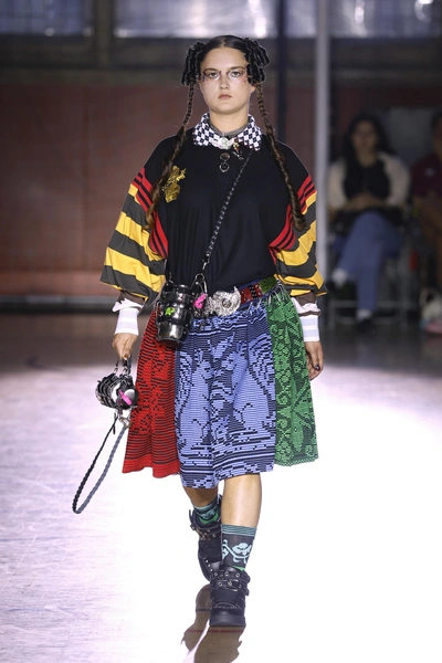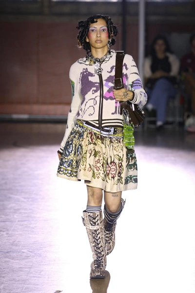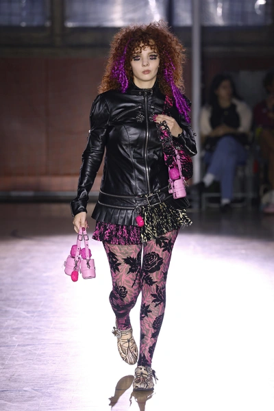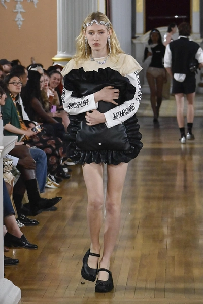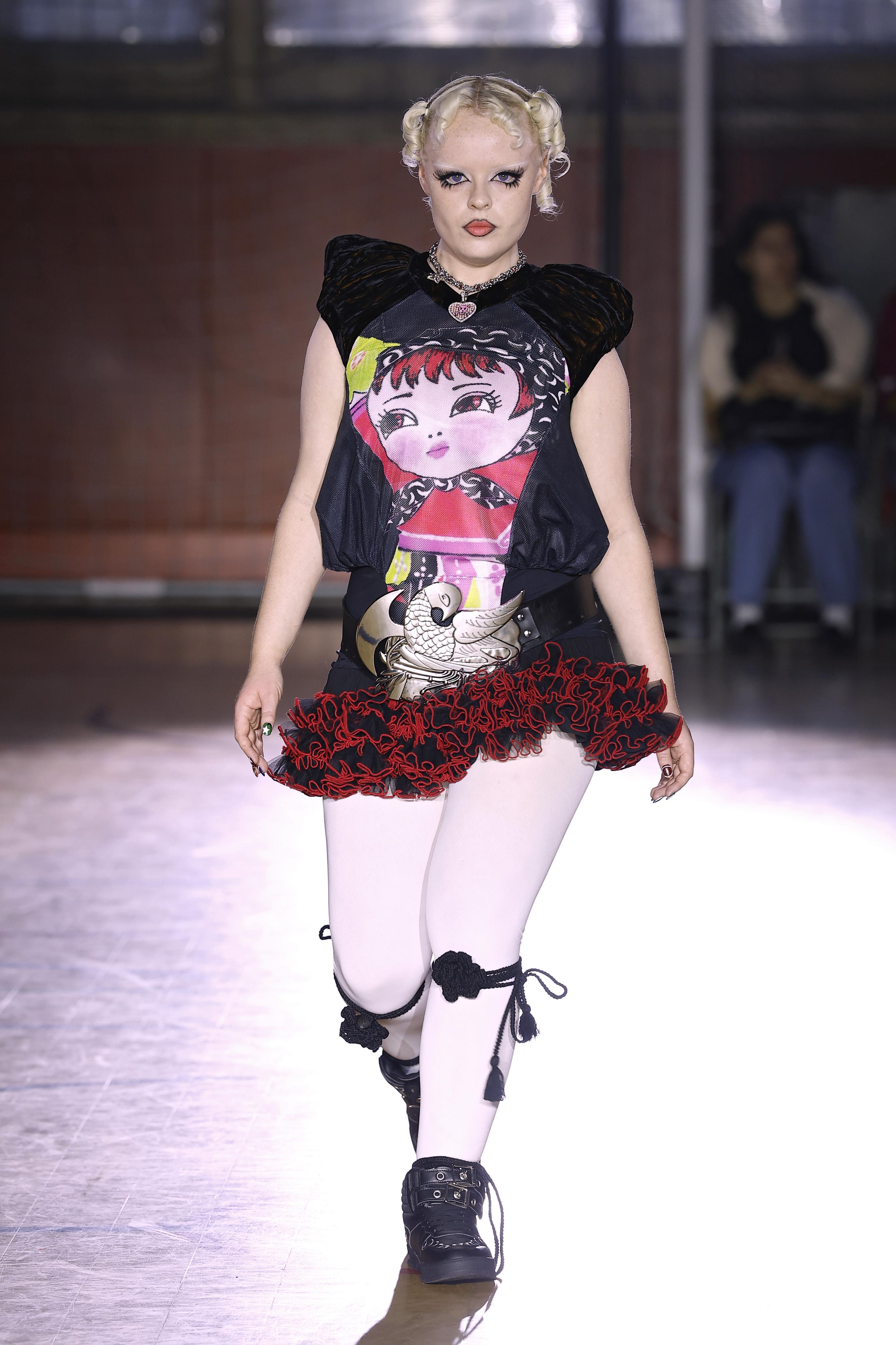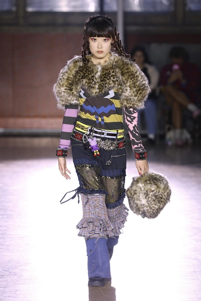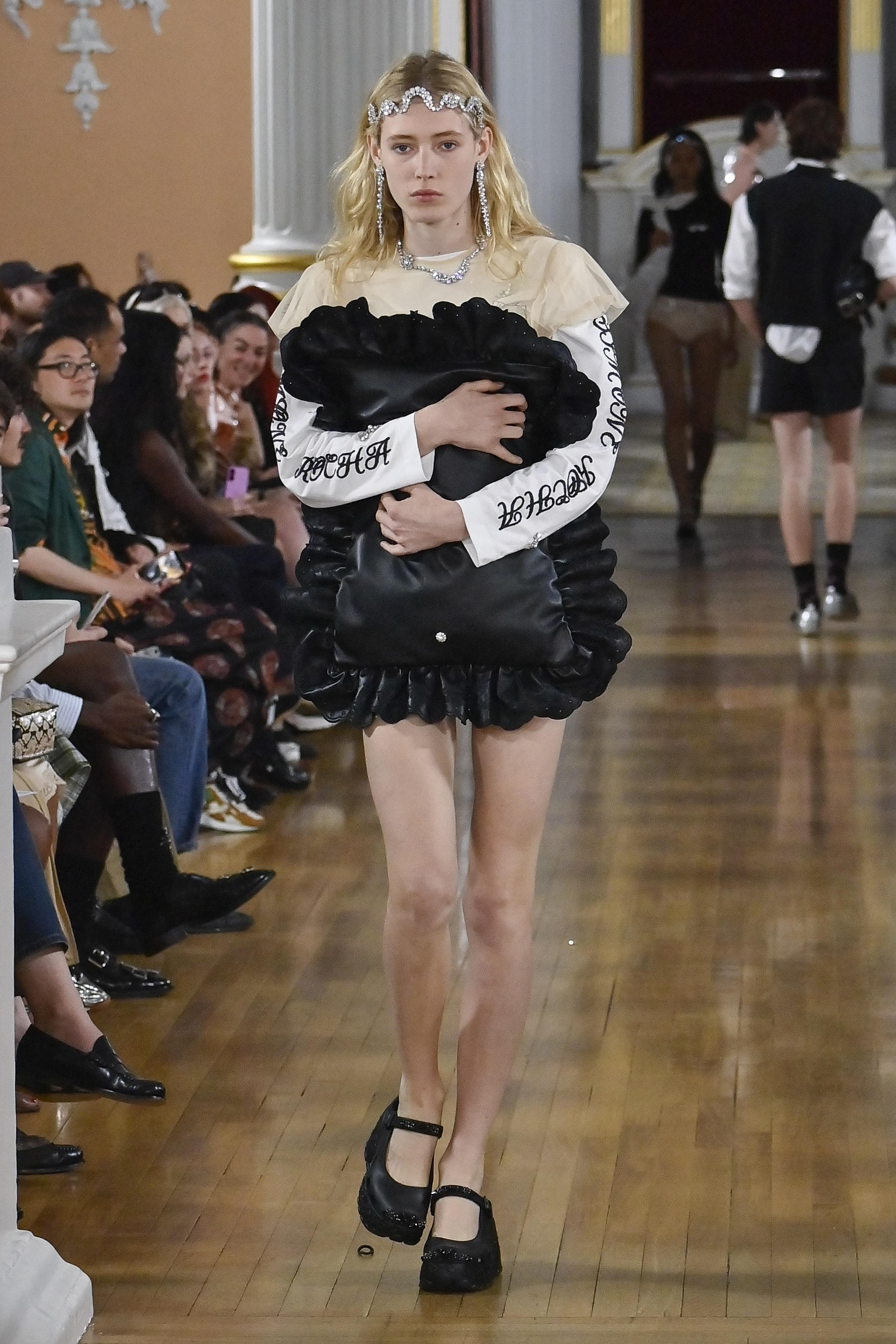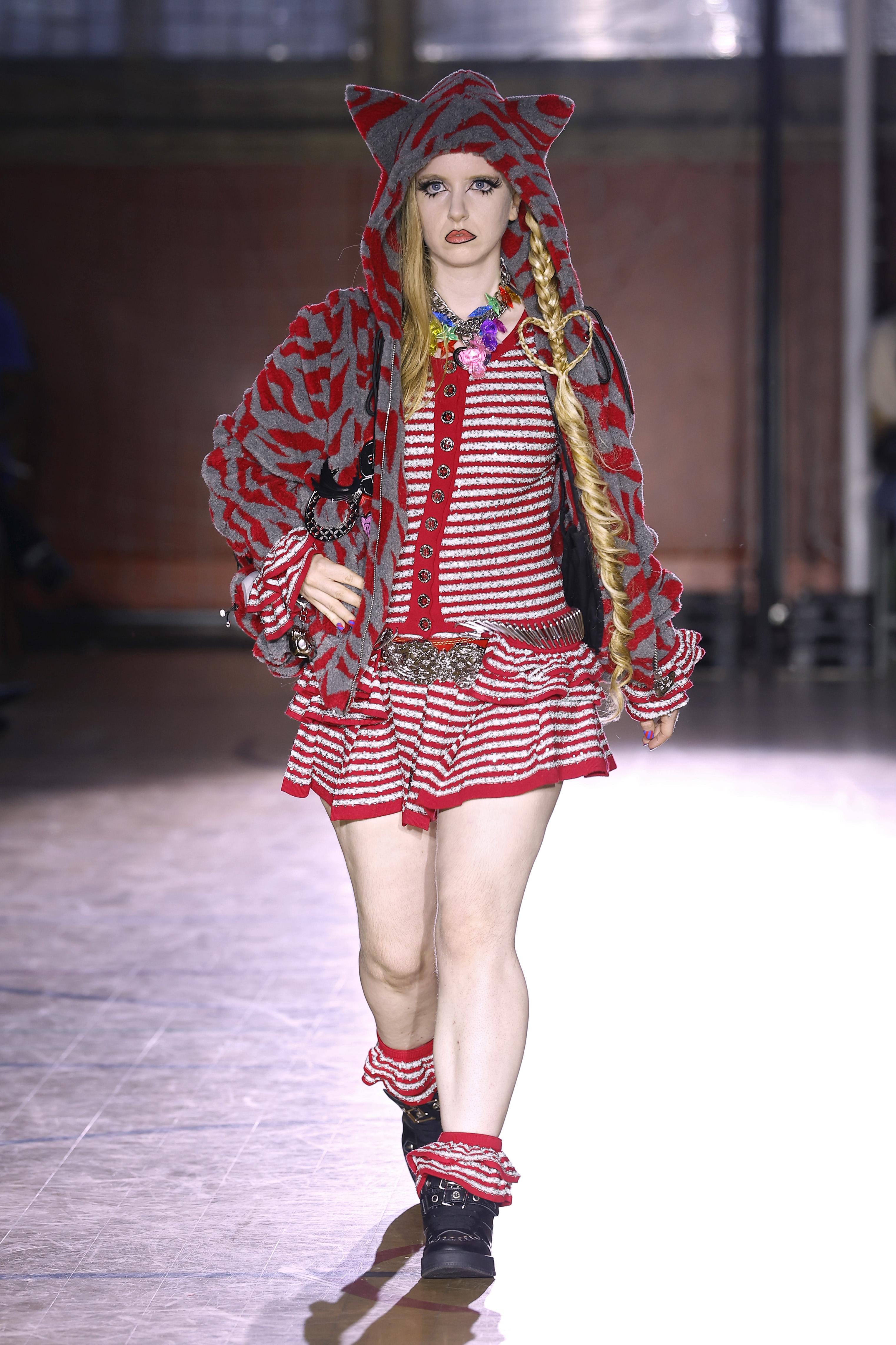 Ироничный кидкор, эклектизм японских субкультур и Y2K-эстетика объединились на показе Chopova Lowena. Кукольные макияжи, мини-юбки с рюшами, цветные колготки и леопардовый мех здесь удачно уживаются с готическими платьями, ремнями со стразами, пушистыми толстовками с кошачьими ушами, а в одном образе запросто соседствуют 4, а то и 5 принтов.