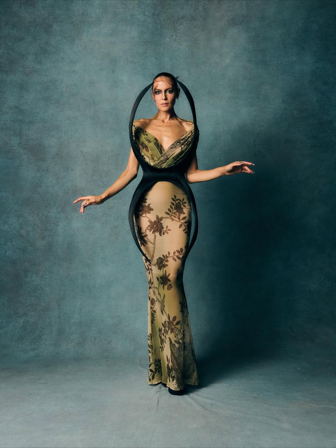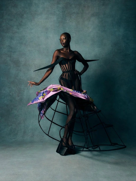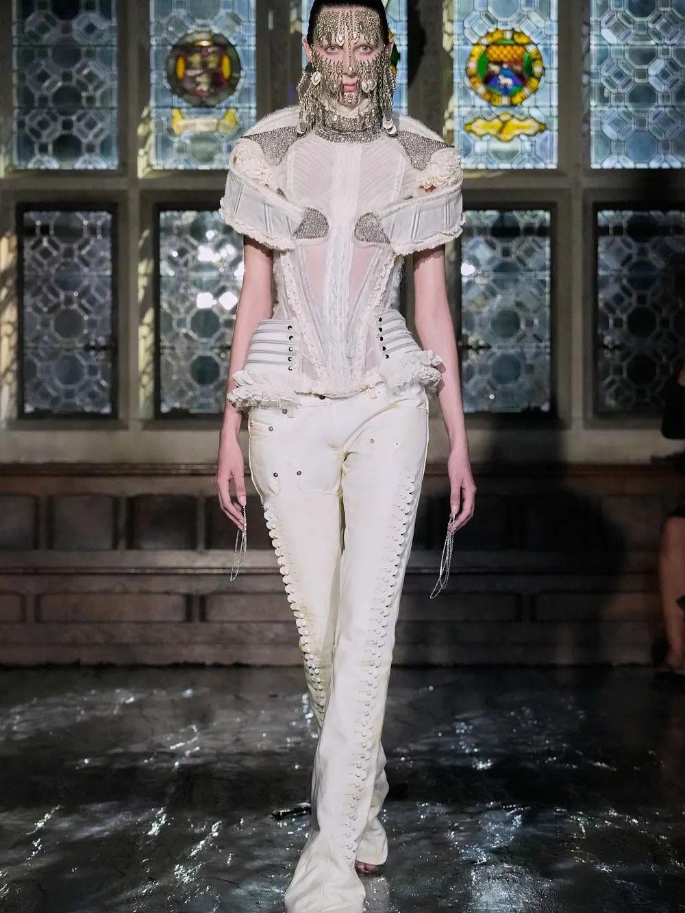 Отдельного внимания заслуживает бурга — металлическое украшение для лица, популярное в странах Персидского Залива. Это отсылка к корням самой Дилары — она из Лондона, но имеет турецкое происхождение (читайте также: Главная преемница Маккуина: как Дилара Финдикоглу завоевала мир моды).