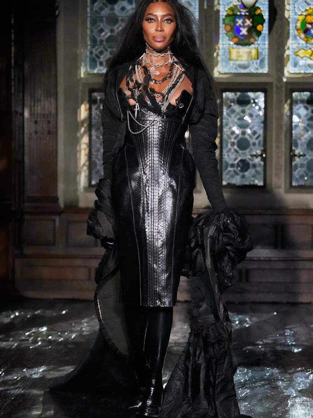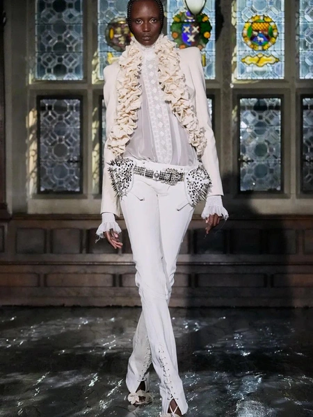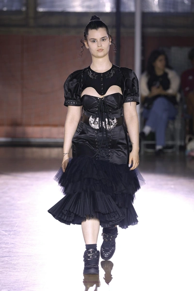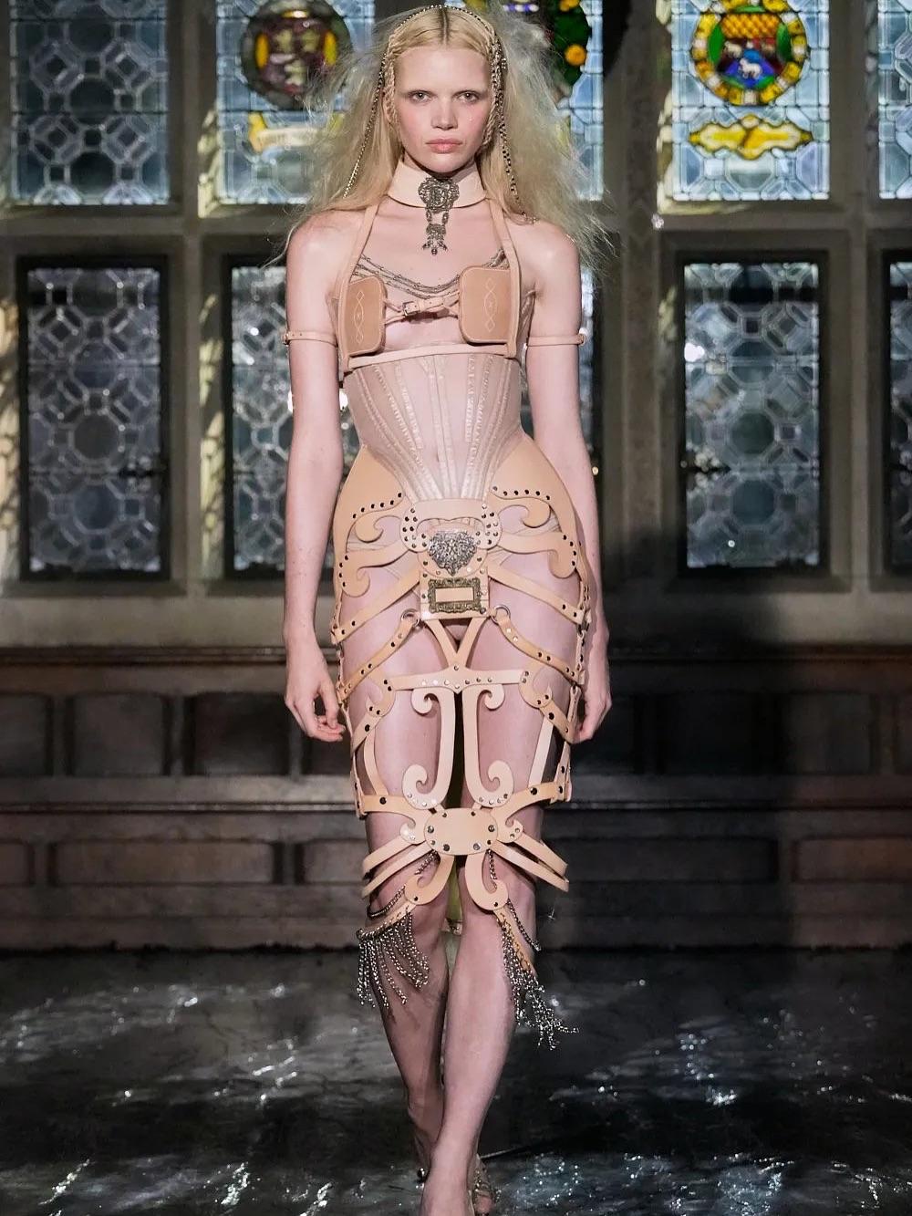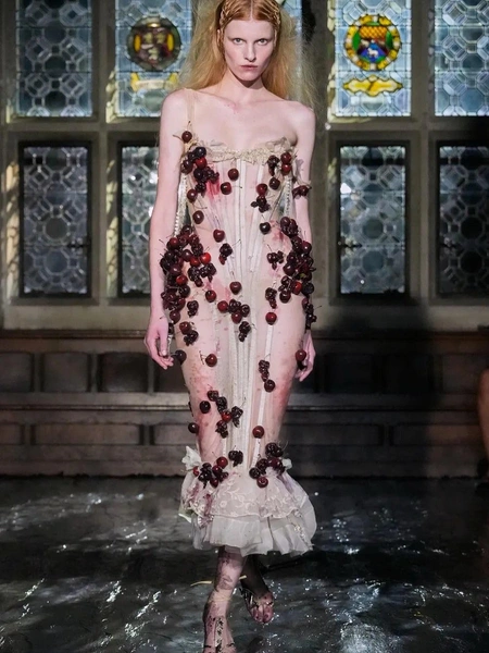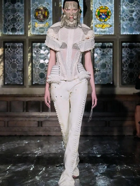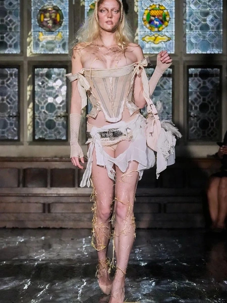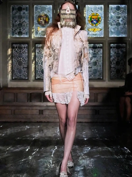 В этот раз дизайнер не стала слишком отходить от вектора, намеченного еще в прошлых коллекциях. Поэтому на подиуме вновь были бесчисленные корсеты, латекс, намеки на оккультизм и алхимию, кожа, сложносочиненные силуэты, castle core, драматичное в сочетании с нежным и трендовая — едва ли не изобретенная самой Диларой — «светлая готика».