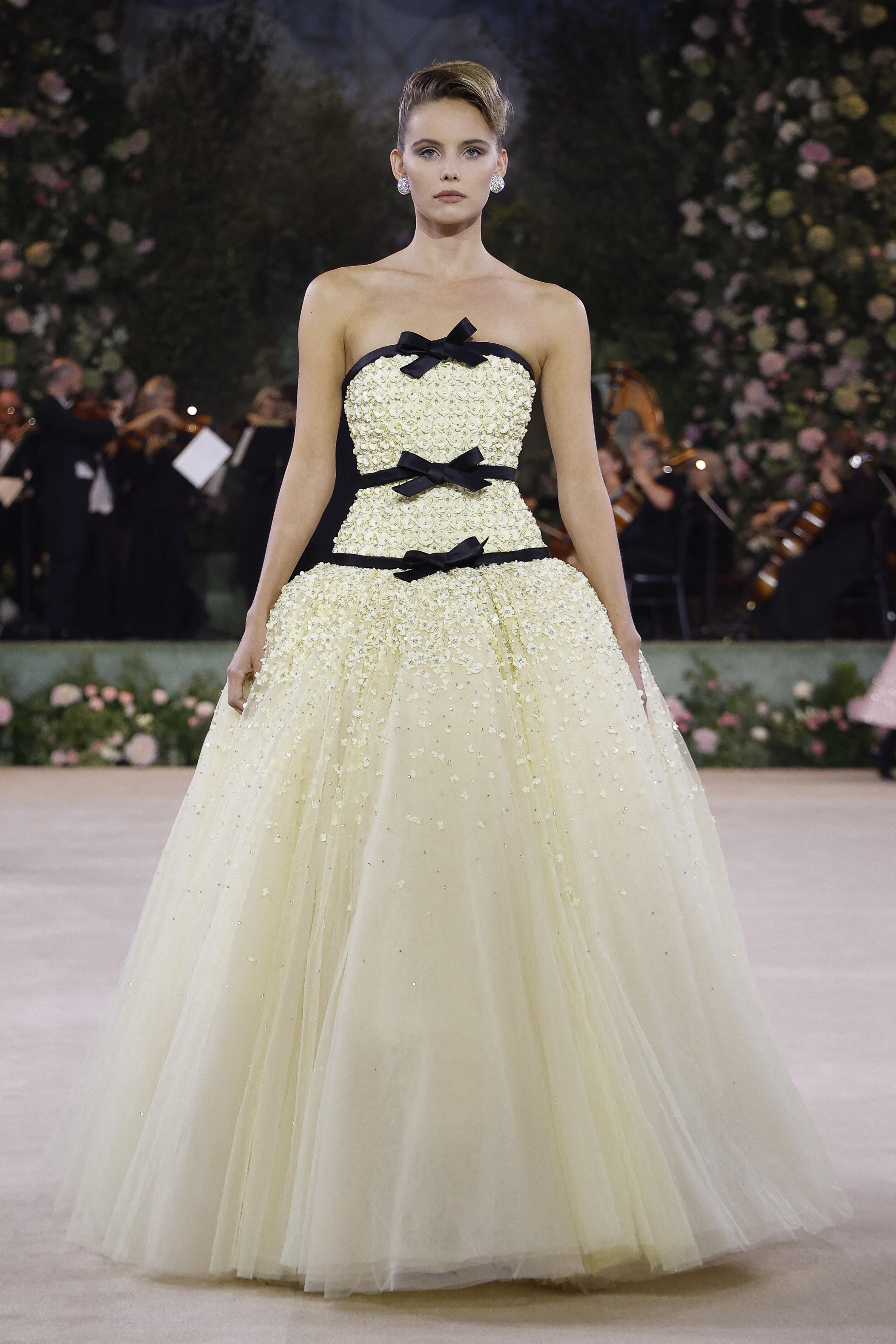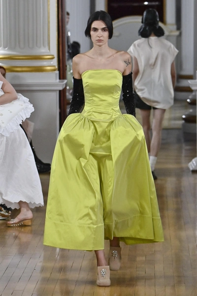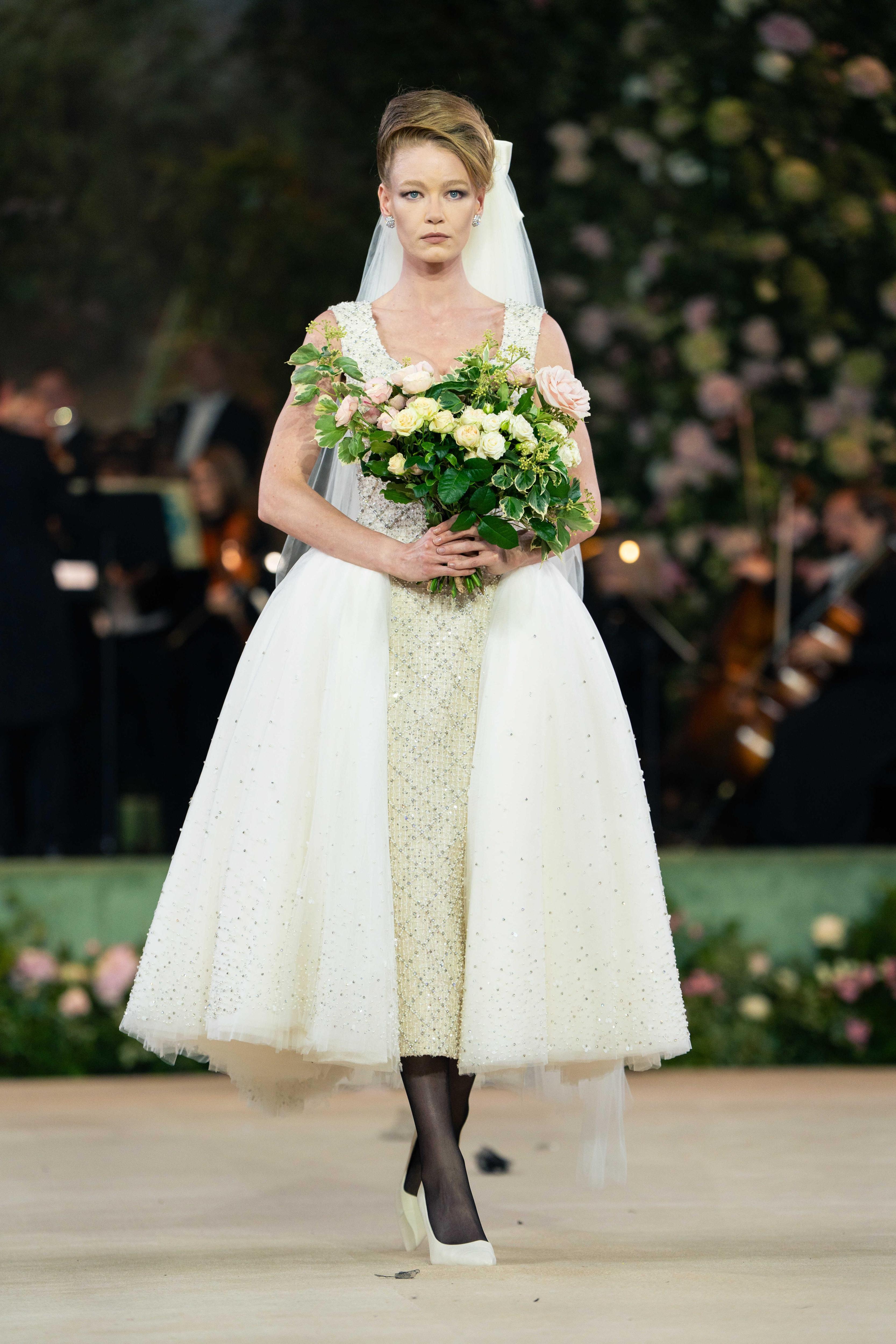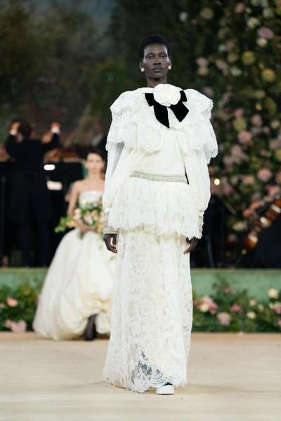 Не назвать весенне-летнюю коллекцию Richard Quinn свадебной довольно непросто: Алеся Кафельникова, Наоми Кэмпбелл и другие модели будто готовились идти под венец прямо с подиума. Вполне привычные для Дома элементы — бантики, рюши, кружево, цветочные узоры и, ни много ни мало, праздничные фасоны — в этот раз обрели абсолютно особенную торжественность. Так что шоу напоминало скорее парад невест.