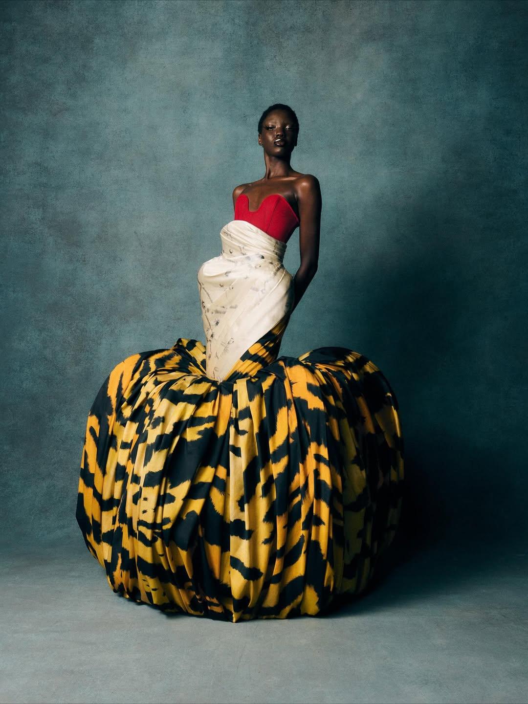 Театральность, игра фасонов, фактур и цветов, запредельный максимализм — так звучат характеристики новой коллекции Harris Reed. Этот лукбук действительно хочется рассматривать: сначала глаз цепляется за гиперболизированные формы, затем — подмечает флоральные узоры и почти абстрактные анималистичные принты, а после заметными становятся тонкие, остроумные детали, вроде сложно скроенных лифов на корсетных платьях и едва заметной растительной вышивки на юбке.