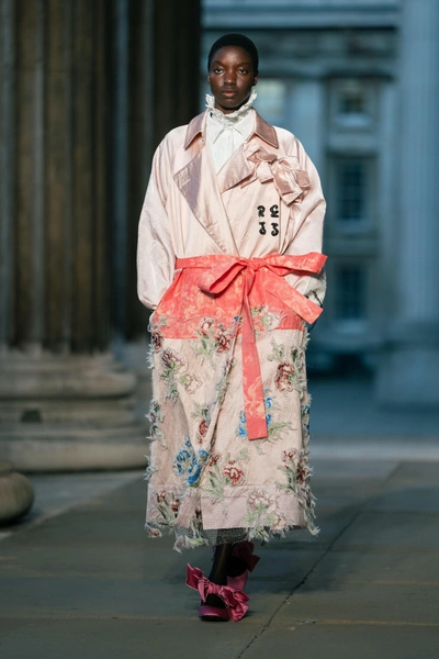 Викторианская эпоха и восточные мотивы легко читаются в новой коллекции Erdem. Здесь появились и воротники-стойки с рюшами, и туго затянутые корсеты, и индийские шелковые плащи-халаты с вышивками, и пояса, напоминающие японские оби. Вместе с ними по подиуму проплывали хлопковые платья, походящие скорее на сари, кринолины и вполне современные брючные костюмы, которые при ближайшем рассмотрении тоже оказываются пропитаны отсылками к Азии. Особенно необычным кажется то, как все этнические мотивы дизайнерам удалось вписать в сочетание с довольно неочевидной обувью — балетками с крупными бантами.