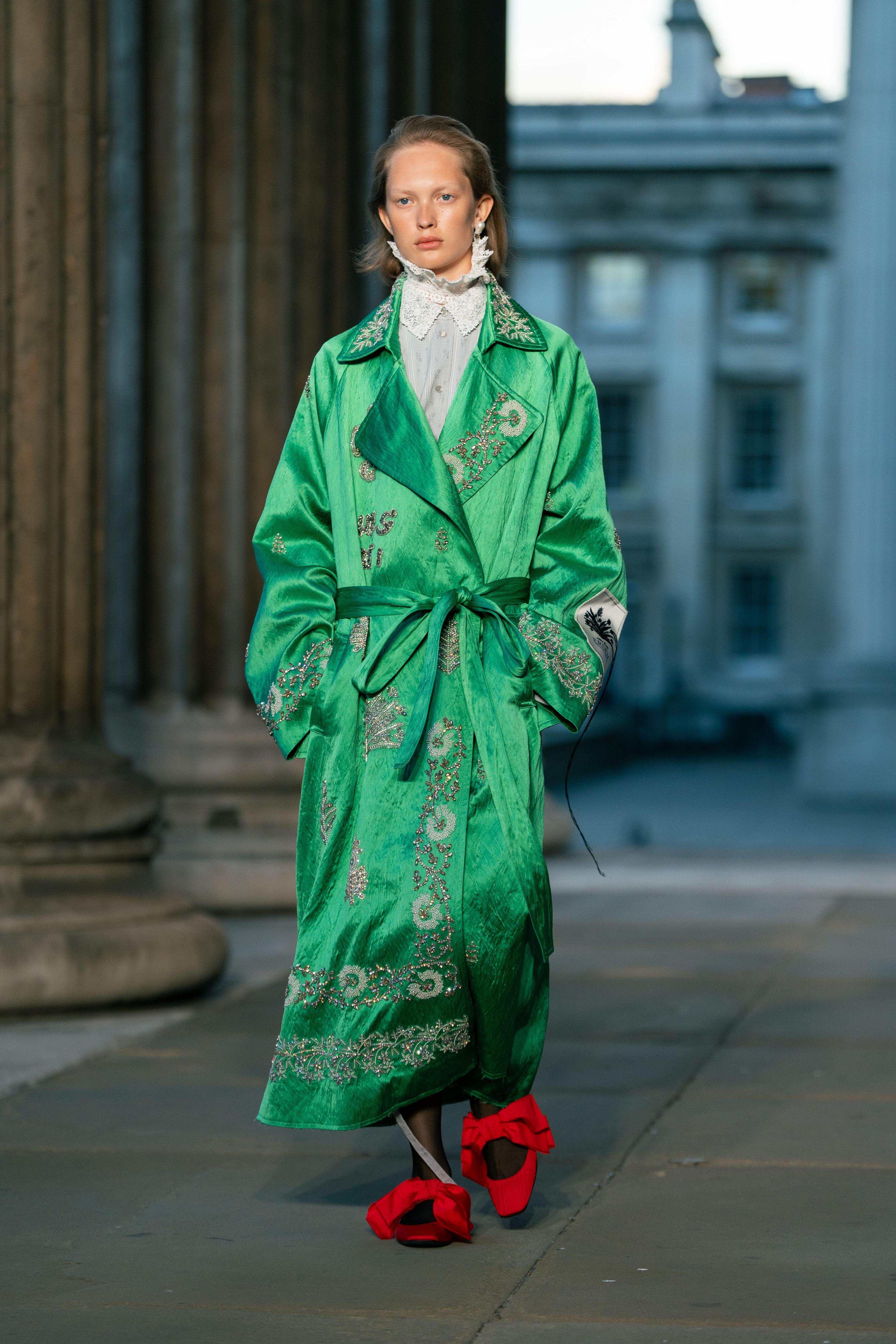 Вдохновением для Эрдема Моралиоглу, пишет WWD, послужила Элен Смит — художница XIX века, которая прославилась как медиум. В ее картинах, которые, как рассказывала сама ясновидящая, она писала после путешествий по времени и пространству, западное и восточное смешивалось подобно тому, что мы увидели на подиуме Erdem.