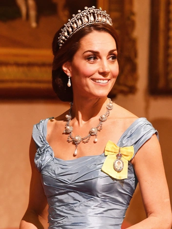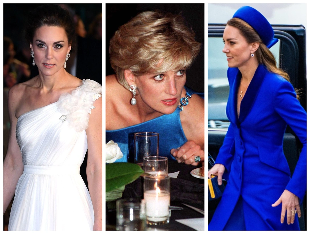 Принцесса Диана была преданной поклонницей сапфиров. И несколько украшений с этим камнем из ее личной коллекции перешли новой принцессе Уэльской. Кэтрин время от времени появляется на публике в сапфировом комплекте из сережек и подвески, дополняющих ее помолвочное кольцо. Диана с удовольствием носила серьги с двумя сапфирами в окружении бриллиантов, которые были свадебным подарком Диане от наследного принца Саудовской Аравии Фахда. В них же Кэтрин видели на параде Trooping The Colour в июне 2022-го.