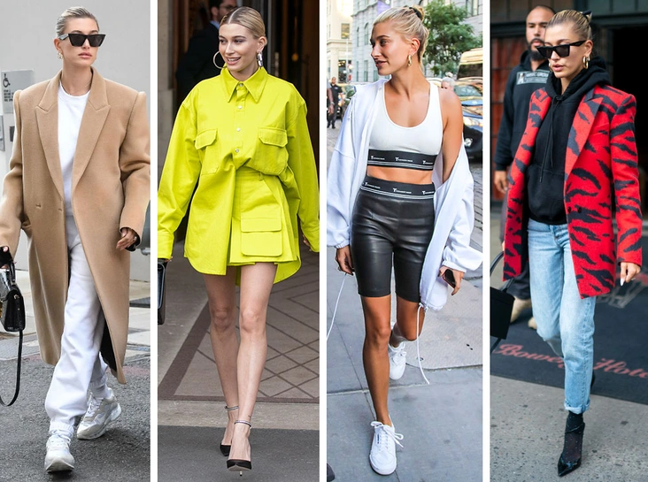 Основа гардероба Хейли — все возможные варианты худи и свитшотов. Как правило, чаще звезда экспериментирует с ними в духе 80-х, сочетая с велосипедками и массивными «папиными» кроссовками. Сама Хейли неоднократно говорила, что огромным источником вдохновения для нее остается принцесса Диана, которая нередко примеряла такие комбинации для визита в спортзал. Правда, Хейли предпочитает носить спортивные ансамбли далеко не только на тренировке: в тех же «формулах» звезду можно встретить и в кафе, и на свидании с мужем, и во время шопинга.