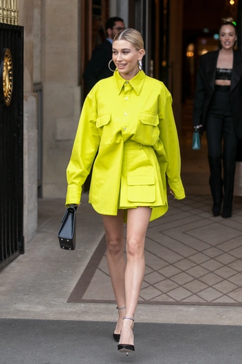 Наряду с аксессуарами Хейли нередко экспериментирует с красочной палитрой, которая также способна сделать минималистичный образ интереснее. Звезда не боится не просто ярких оттенков, но даже слепящих неоновых цветов. Как правило, выбирая необычную палитру, звезда предпочитает оставаться сдержанной в крое и аксессуарах и выбирает более лаконичные вещи и нейтральную обувь.