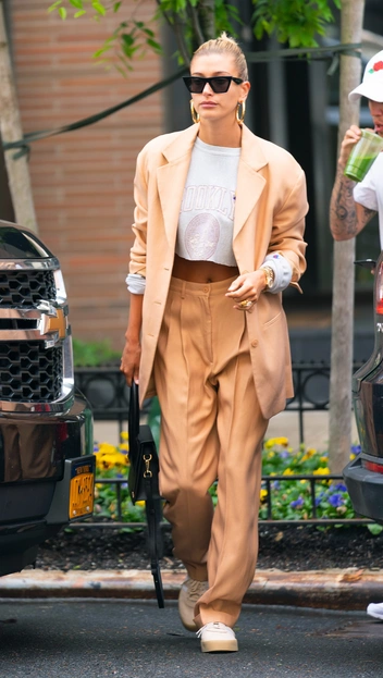 Хейли обожает андрогинные наряды (см. пункт про мужской гардероб). И чаще всего звезда делает выбор в пользу объемных костюмов с жакетами с мужского плеча. Для стилизации у нее есть беспроигрышный вариант — кроп-топы и любимые массивные кроссовки. Укороченный топ, обнажающий живот, сбалансирует маскулинный наряд, а практичная обувь позволит весь день проводить на ногах — то, что нужно юной и крайне занятой звезде (читайте также: Как подобрать брючный костюм, который вас не разочарует).