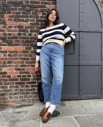 В поисках идеальных джинсов отдайте предпочтение фасонам прямого кроя или слегка зауженного — они сглаживают линию бедер и отлично моделируют фигуру. Не забывайте обращать внимание и на высоту посадки. Трендовую низкую из лихих 90-ых стоит избегать, выбрав классическую высокую.