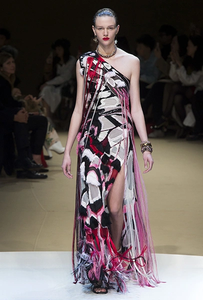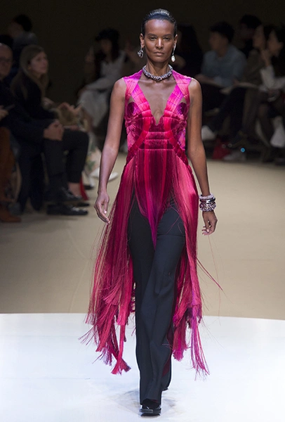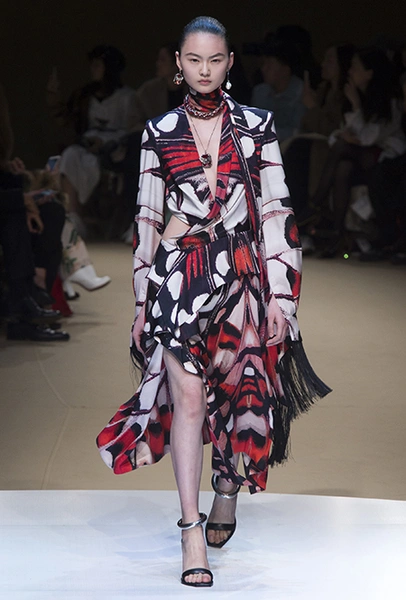 В коллекции есть жесткие футуристичные корсеты и лифы с нашивками, чья форма напоминает острые плавники хищных рыб. Здесь много ярких принтов, которые сложно отнести к анималистическим, но они отдаленно похожи то на рисунки на коже рептилий, а то на перстрое оперение тропических птиц (птицы вообще – один из фетишей Александра Маккуина).