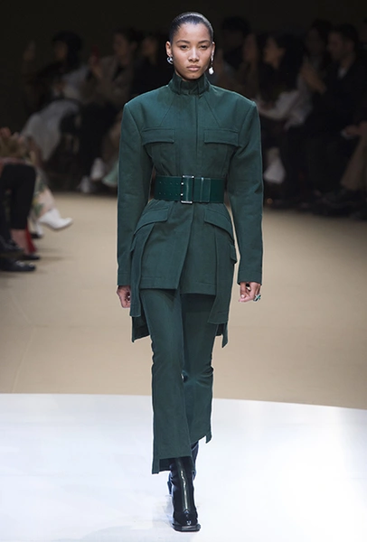 Много здесь и брючных костюмов – так называемых power suits. У Бертон они то классические черные с приталенными жакетами и с бахромой, свисающей с рукавов (бахрома – любимая «фишка» уже самой Сары, так же как торчащие из швов нити), то темно-зеленые, напоминающие военную форму. И в тех и в тех женщина выглядит сильной, непобедимой, готовой дать отпор – как конкурентам, так и тем, кто посмеет посягнуть на ее свободу, физическую или сексуальную. Словом, коллекция сама по себе – отличный демарш в поддержку движения Time’s Up.