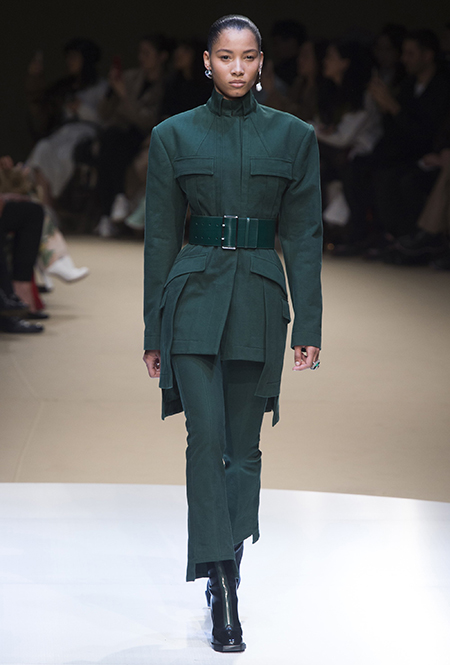 Много здесь и брючных костюмов – так называемых power suits. У Бертон они то классические черные с приталенными жакетами и с бахромой, свисающей с рукавов (бахрома – любимая «фишка» уже самой Сары, так же как торчащие из швов нити), то темно-зеленые, напоминающие военную форму. И в тех и в тех женщина выглядит сильной, непобедимой, готовой дать отпор – как конкурентам, так и тем, кто посмеет посягнуть на ее свободу, физическую или сексуальную. Словом, коллекция сама по себе – отличный демарш в поддержку движения Time’s Up.