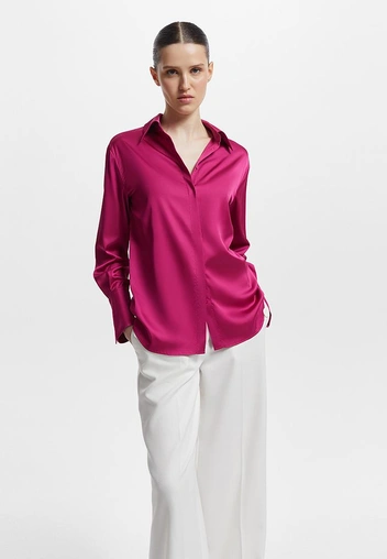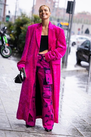 Летний розовый бум отходит в сторону — в 2023 году его стало слишком много. Модный барбикор дизайнеры интерпретируют в новом сезоне и предлагают сменить нежные оттенки на смелую фуксию. Вы можете выбрать как тотал-лук, так и отдельные предметы гардероба: блузу, свитер или футболку.